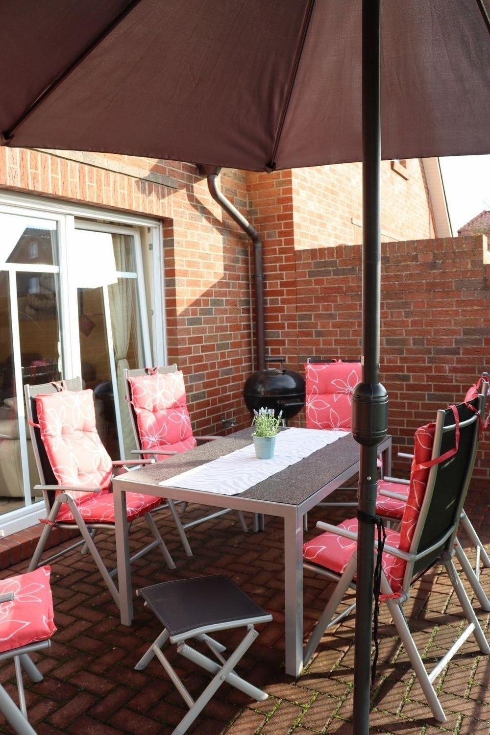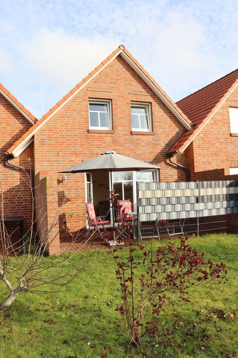 Auf der 20 qm großen Terrasse mit Gartenmöbeln, Sonnenschirm und Kugelgrill können Sie die Sonne genießen und Ihren Nachwuchs beim Spielen im Garten beobachten.