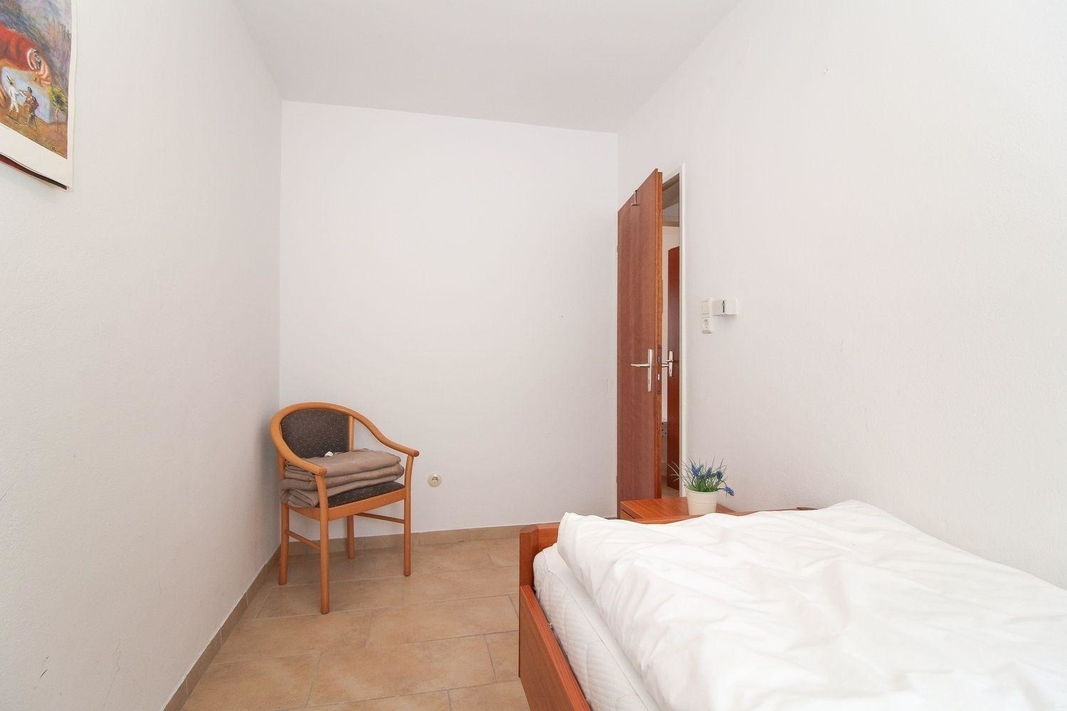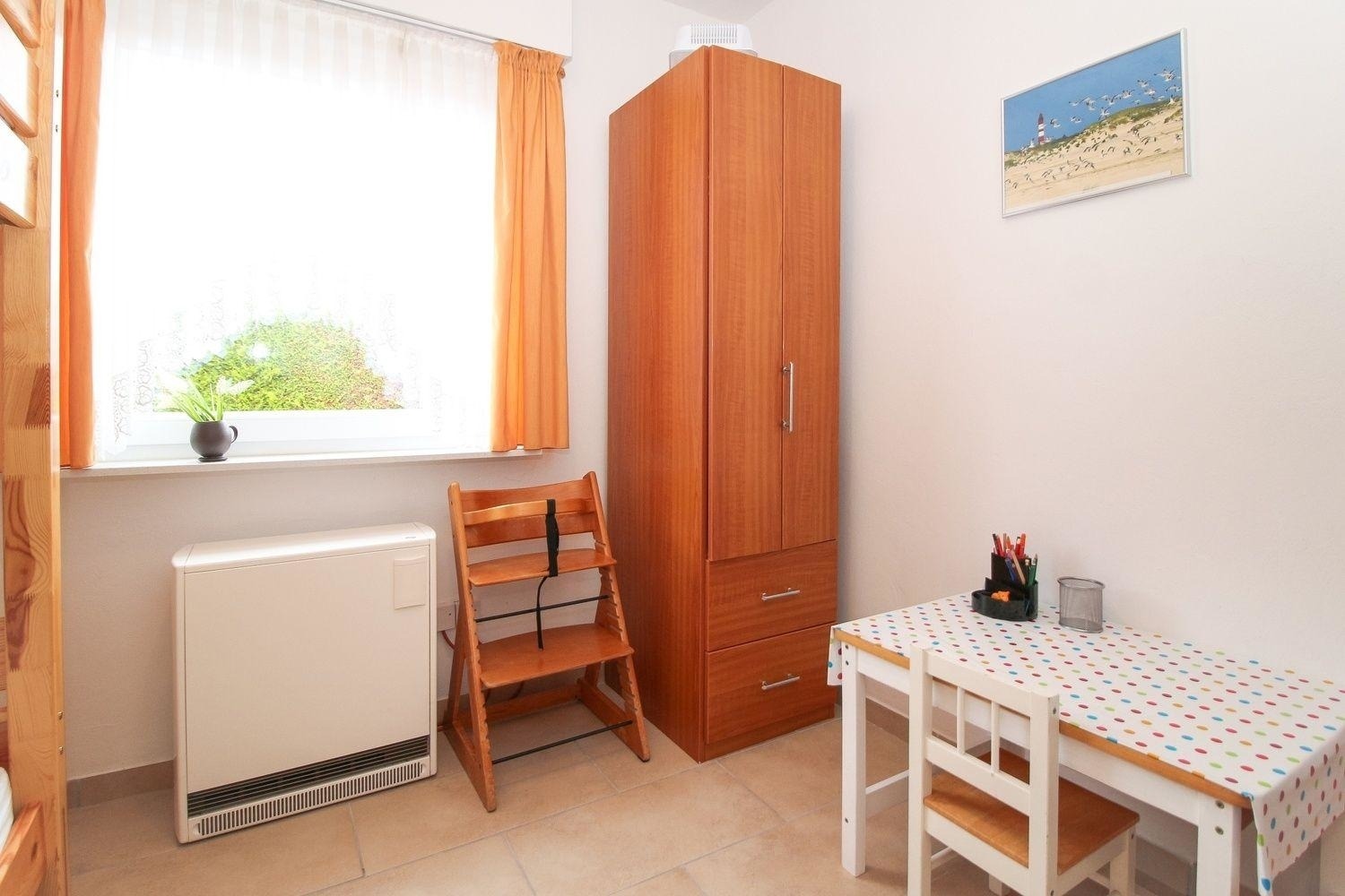 Das Elternschlafzimmer ist mit einem großen Doppelbett, Kleiderschrank und Nachtkonsolen ausgestattet. Das Kinderzimmer verfügt über ein Hochbett, Spieltisch und Kleiderschrank. Im dritten Schlafzimmer finden Sie ein weiteres Einzelbett sowie Nachtkonsole und Kleiderschrank. Alle Zimmer lassen sich mit Außenjalousien verdunkeln.