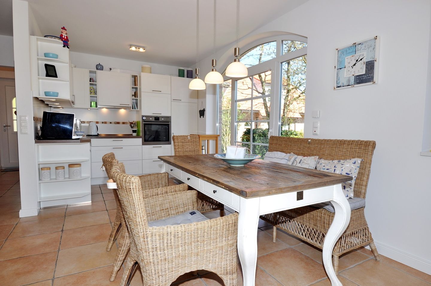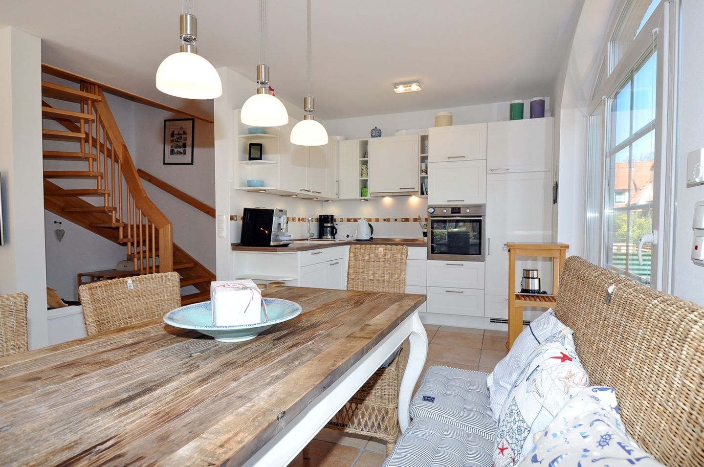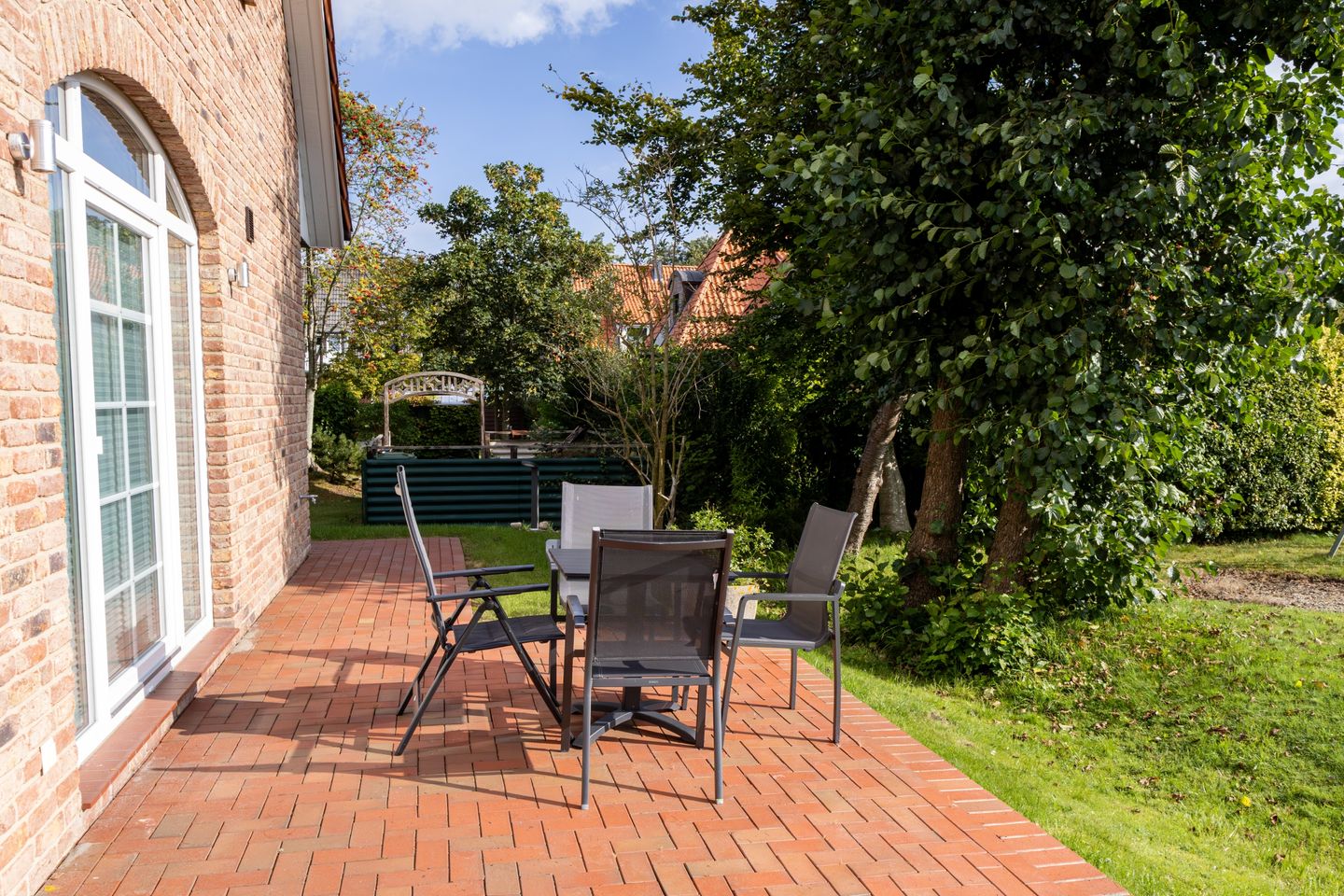 Die Haushälfte verfügt insgesamt über 2 Terrassen, die mit Gartenmöbeln, Sonnenschirm und einem Strandkorb ausgestattet sind, zudem steht Ihnen ein Grill zur Verfügung. Die hochwertige Ausstattung der Küche lädt zum gemeinsamen Kochen ein.
