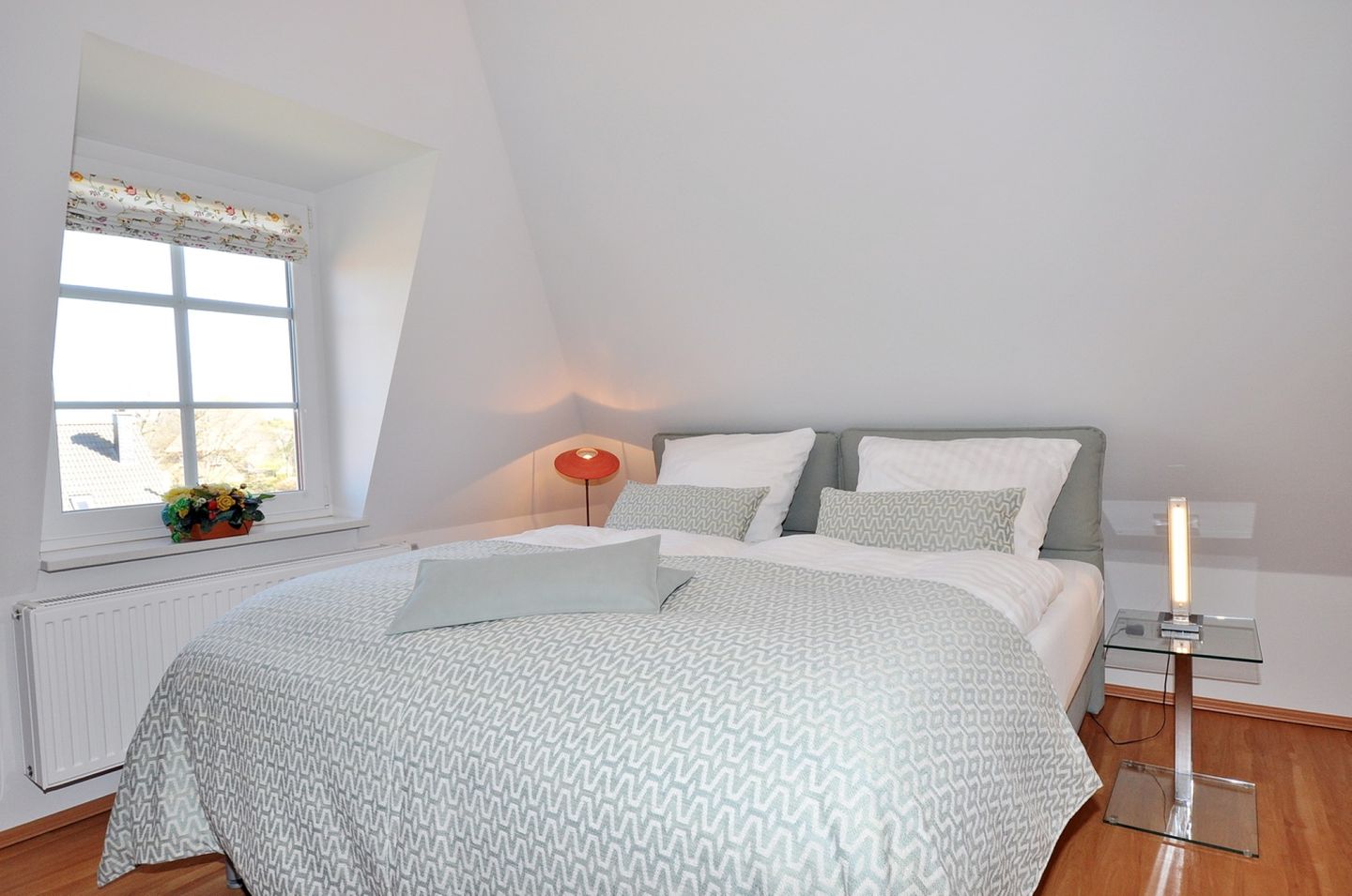 Dachgeschoss: ein Studio mit einem Ruf-Premium-Boxspringbett (180 x 200 cm – durchgehender Topper) und einem Schreibtisch