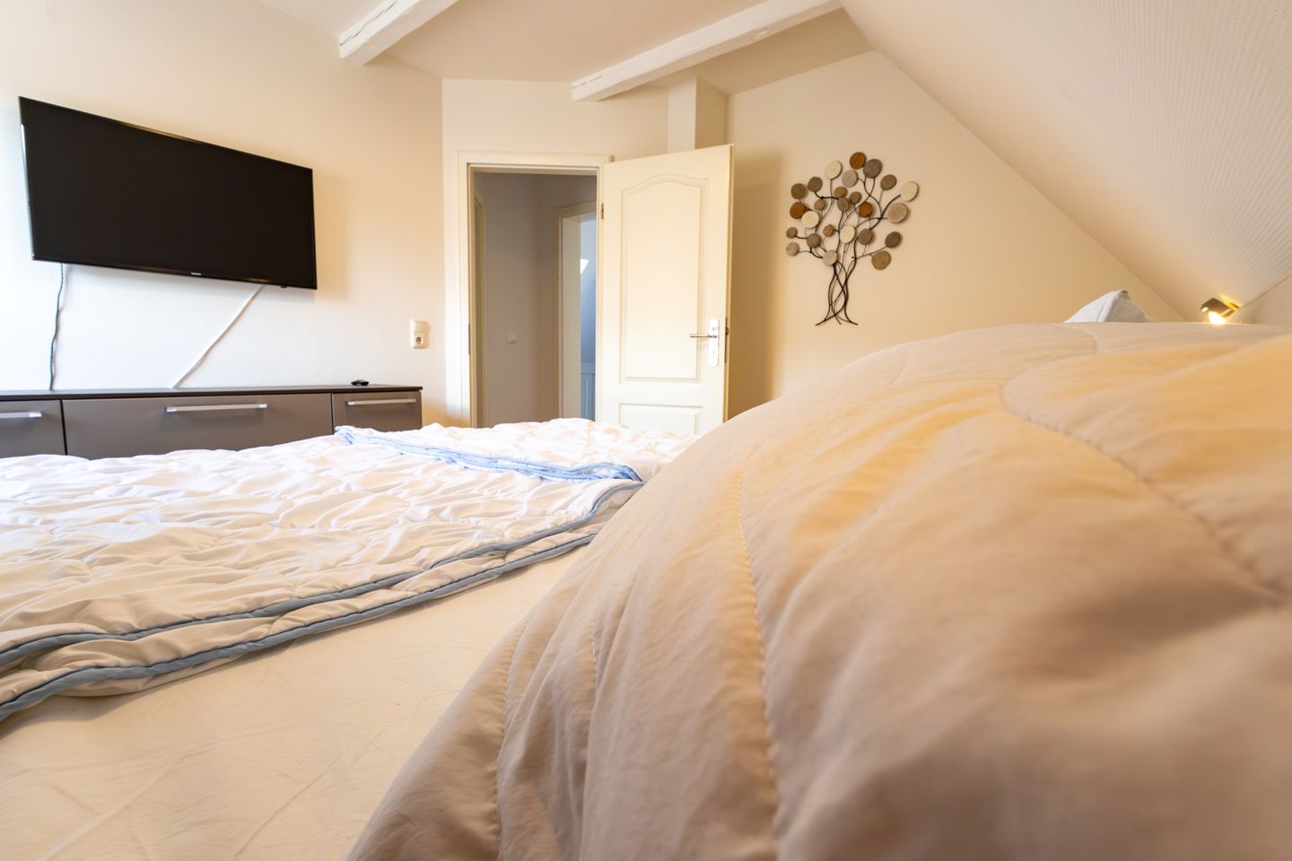 Obergeschoss: ein Schlafzimmer mit Doppelbett (180 x 200 cm – durchgehender Topper), ein Schlafzimmer mit Einzelbett (110 x 190 cm), ein Lesezimmer, ein Duschbad / WC