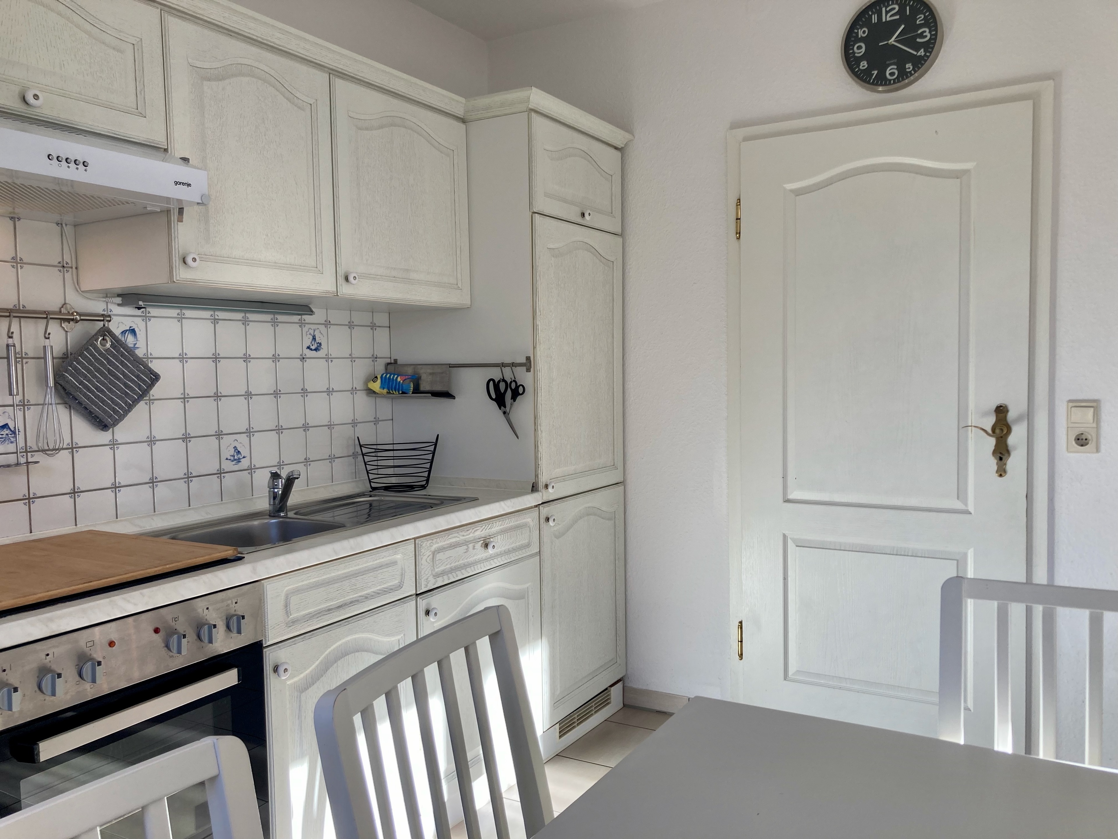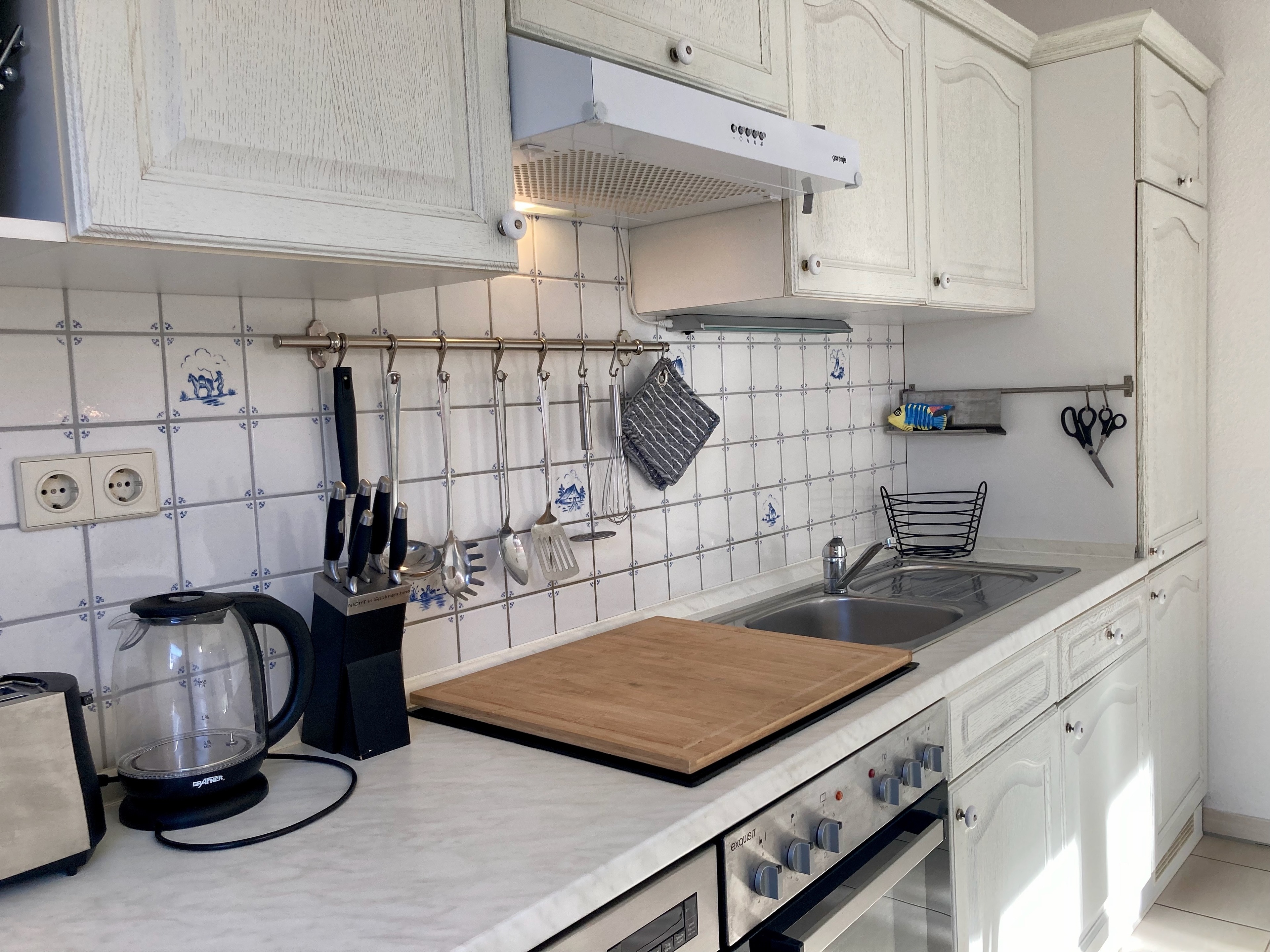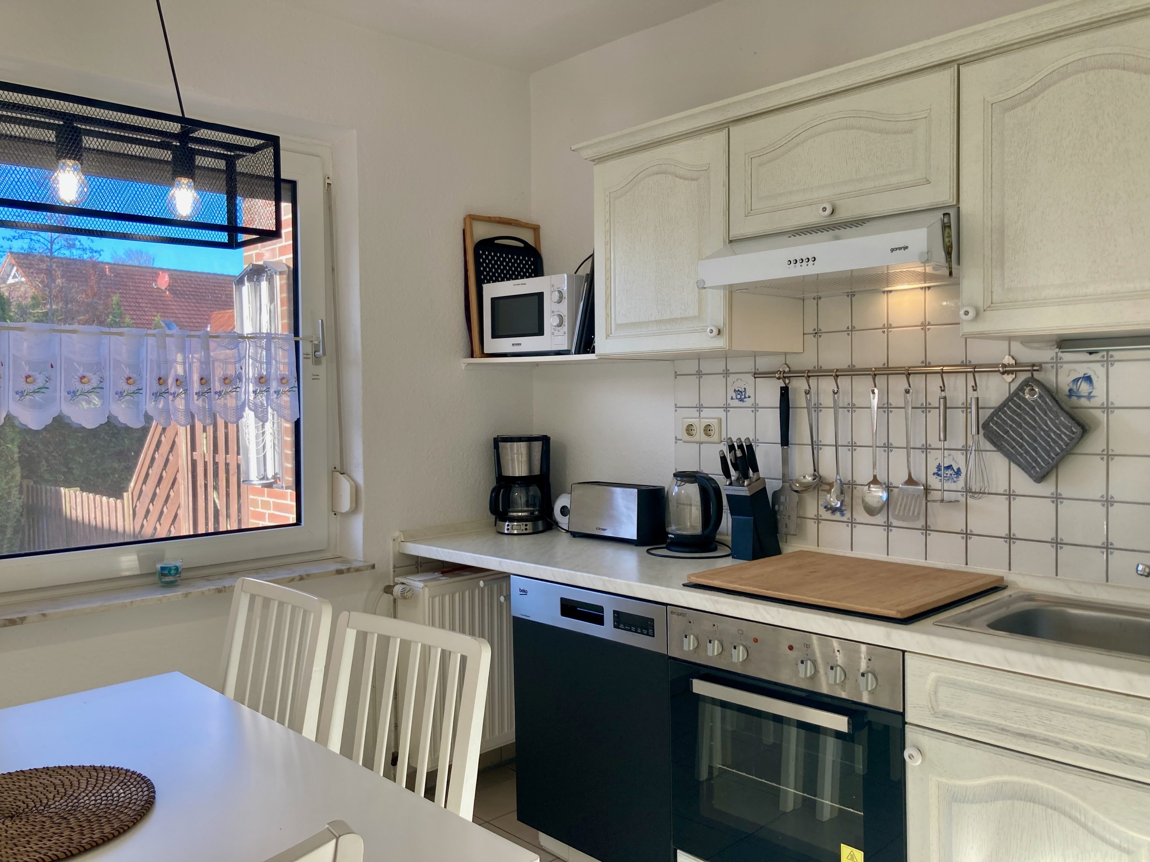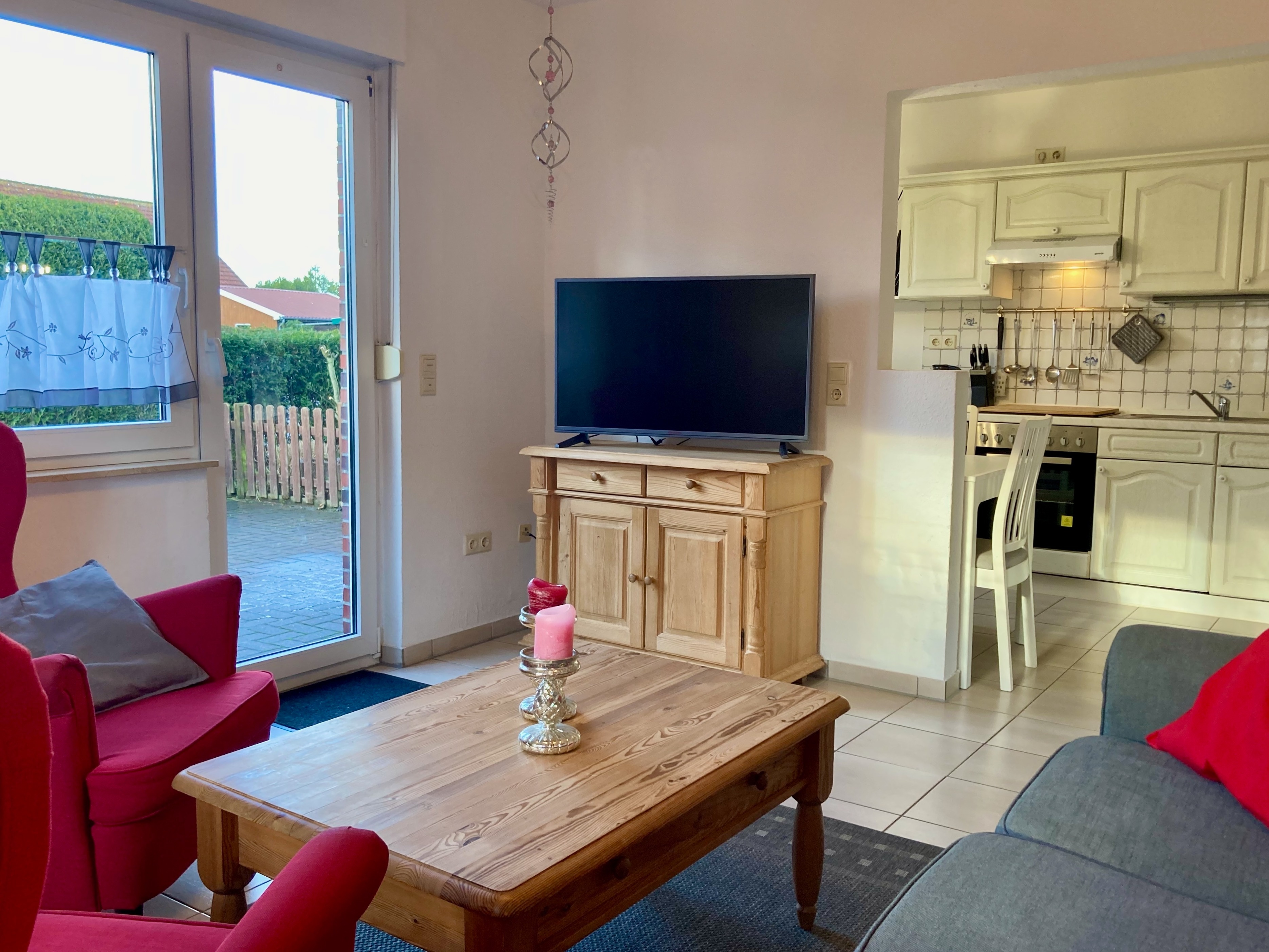 Gemütliche Einrichtung und gute Ausstattung mit überwiegend hellem Weichholzmobiliar sowie maritimen Deko-Elementen. Fliesenböden, in den Schlafbereichen Laminatfußböden. Fliegenschutzgitter in allen Räumen. Bügelbrett/-eisen. Kinderbett, Hochstuhl und mobile Kindersicherung vorhanden, Bollerwagen im Gartenhaus zur freien Nutzung. Tischfußball. Safe. Gas-Zentralheizung.