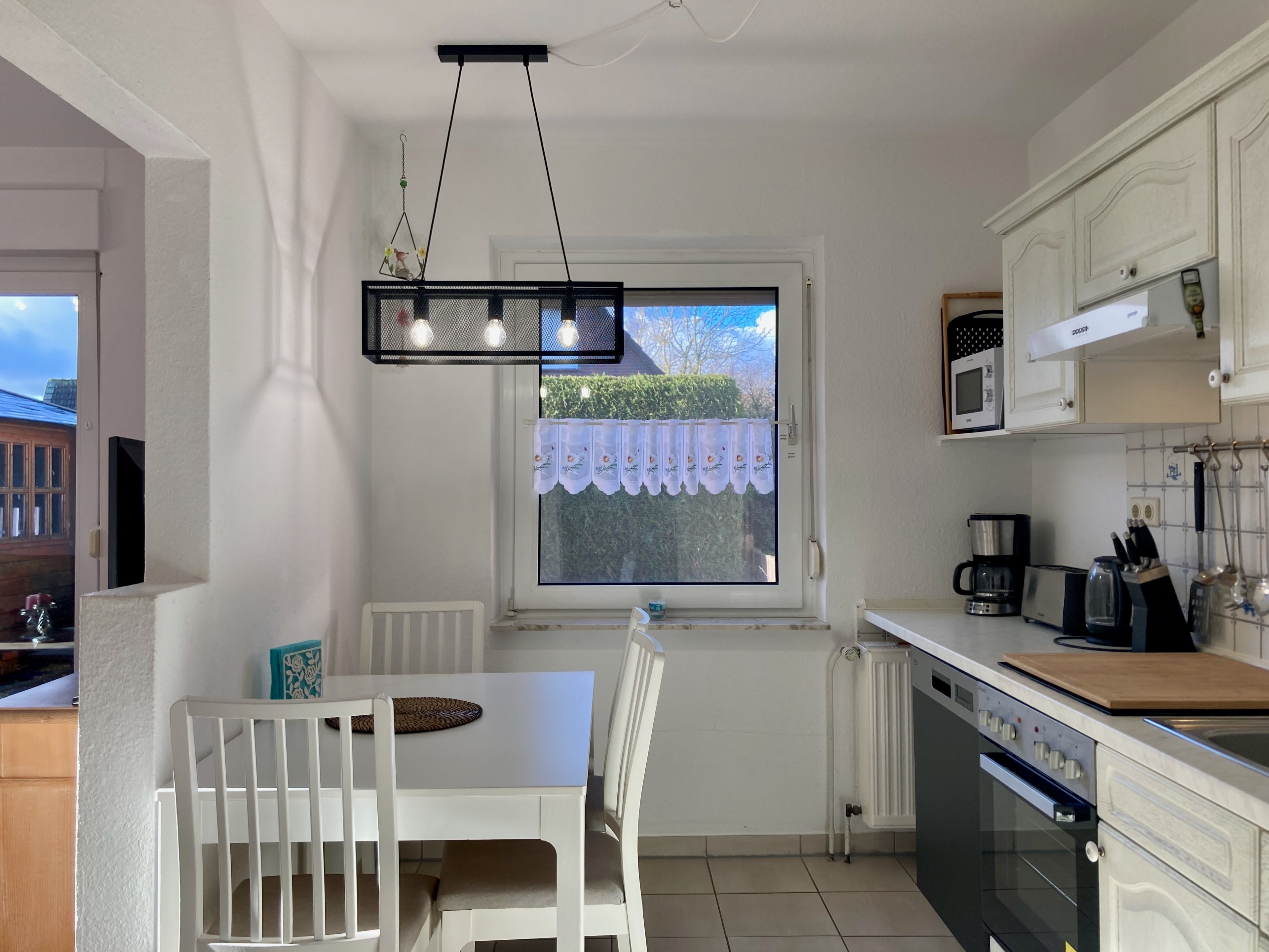 Erdgeschoss: Flur. Wohnraum mit Sitzgruppe, Sat-TV (Amazon-Fire-TV), Radio/CD, Internetzugang (wlan, gratis), Terrassenausgang. Zum Wohnraum offene Küche mit Einbauherd (4 Ceranfelder, Backofen), Geschirrspüler, Kühlschrank, Mikrowelle, Airfryer, Kaffeemaschine, Toaster, Wasserkocher sowie Essplatz (Esstisch ausziehbar). Schlafzimmer mit Boxspringbett (1,40 m x 2 m), kleine Sitzecke. Dusche/WC mit Waschmaschine. Vom Flur Treppe ins Obergeschoss (Dachschrägen): Doppelzimmer mit kleiner Sitzecke. Einzelzimmer. WC. Abstellraum.