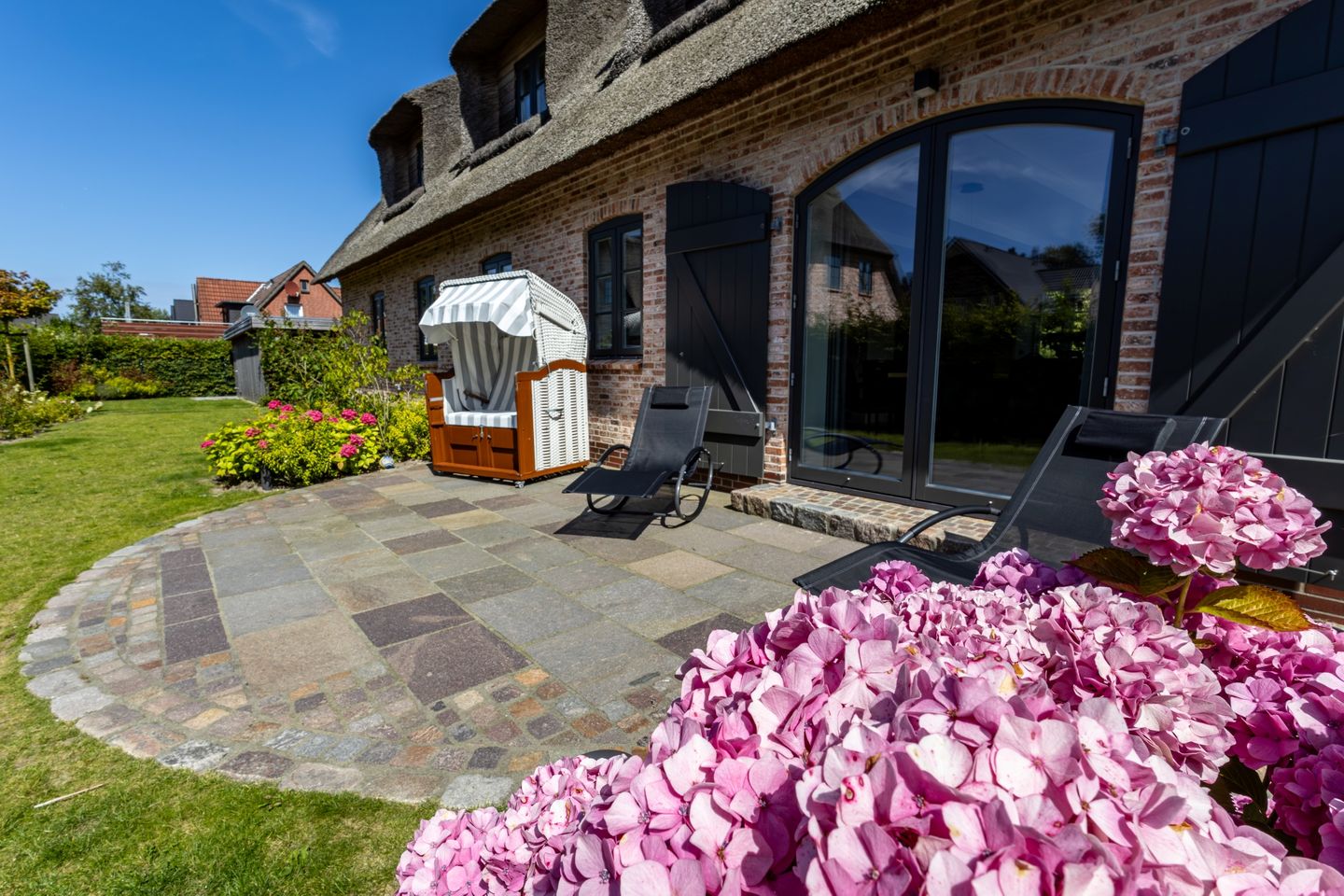 Der Garten ist komplett eingezäunt, während der Saison stehen Gartenmöbel und ein Strandkorb bereit.