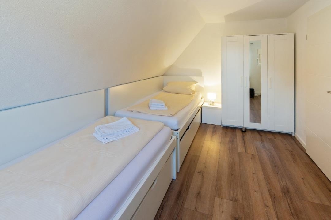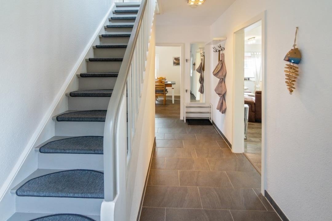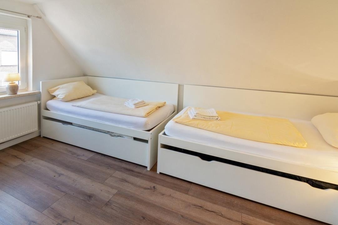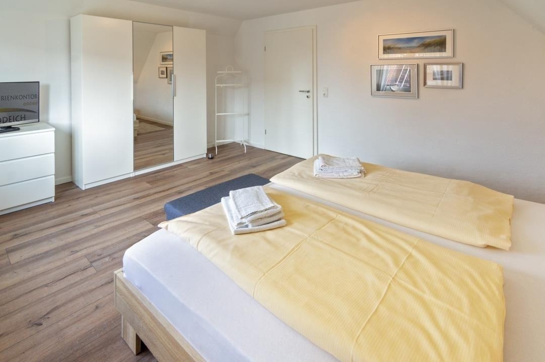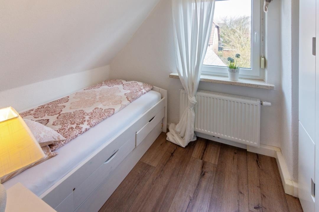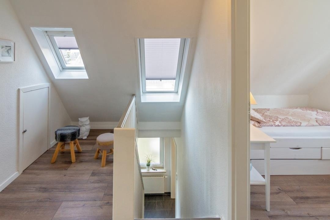 Ein modernes Badezimmer mit Dusche und WC sorgt für täglichen Komfort. Über die Treppe mit hellen Dachfenstern gelangt man in das Obergeschoss, das durch seine klare Gestaltung und sein angenehm luftiges Raumgefühl überzeugt. Hier befinden sich ein liebevoll eingerichtetes Zweibettzimmer sowie weitere Schlafräume, die sich perfekt für Familien oder gemeinsam reisende Gäste eignen. Insgesamt stehen drei separate Schlafzimmer zur Verfügung: ein Doppelzimmer mit Ehebett und Sat-TV, ein Zweibettzimmer im oberen Bereich sowie ein zusätzliches Einzelzimmer. Alle Räume sind hell gestaltet, freundlich eingerichtet und bieten ausreichend Stauraum – ideale Voraussetzungen für erholsame Nächte und einen entspannten Familienurlaub in Norddeich.