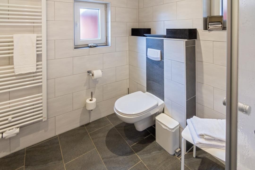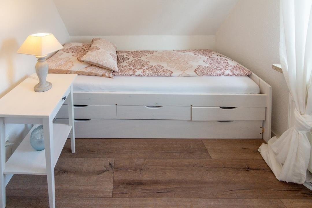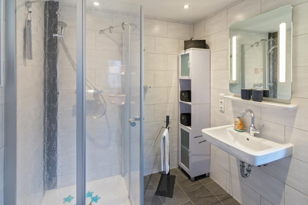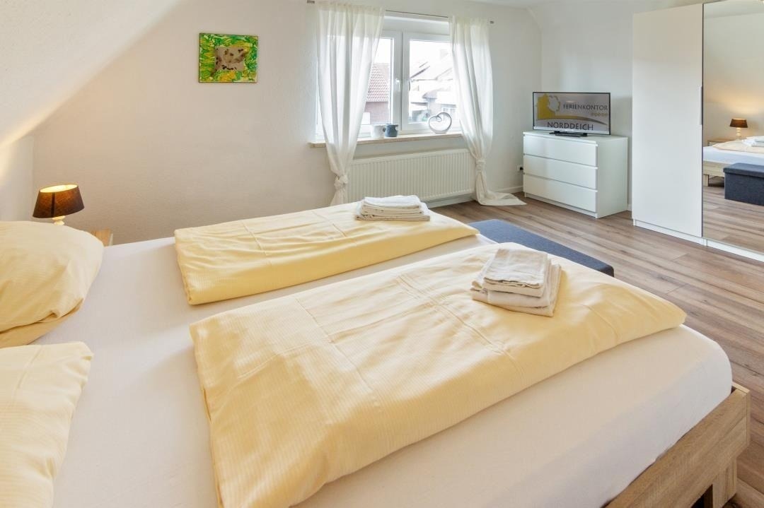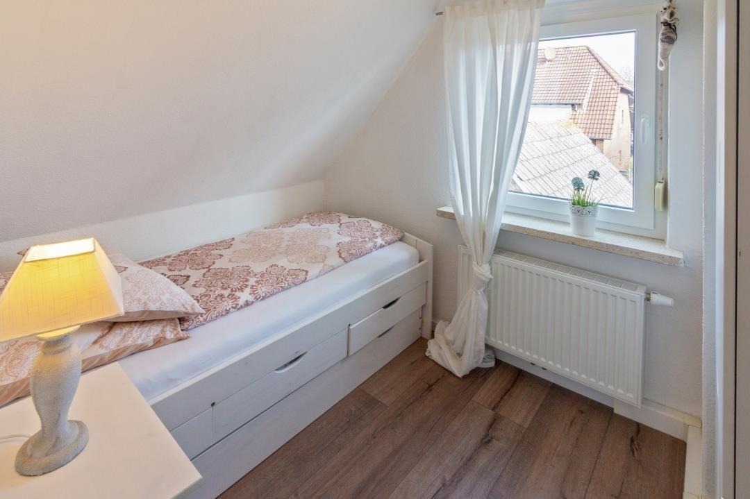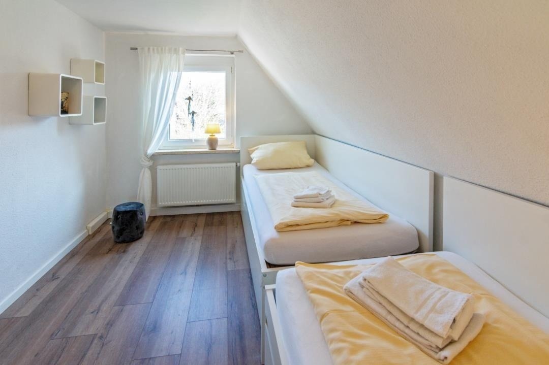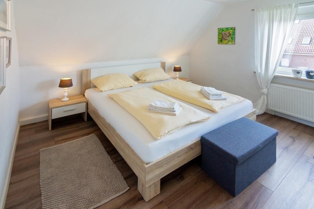 Ein modernes Badezimmer mit Dusche und WC sorgt für täglichen Komfort. Über die Treppe mit hellen Dachfenstern gelangt man in das Obergeschoss, das durch seine klare Gestaltung und sein angenehm luftiges Raumgefühl überzeugt. Hier befinden sich ein liebevoll eingerichtetes Zweibettzimmer sowie weitere Schlafräume, die sich perfekt für Familien oder gemeinsam reisende Gäste eignen. Insgesamt stehen drei separate Schlafzimmer zur Verfügung: ein Doppelzimmer mit Ehebett und Sat-TV, ein Zweibettzimmer im oberen Bereich sowie ein zusätzliches Einzelzimmer. Alle Räume sind hell gestaltet, freundlich eingerichtet und bieten ausreichend Stauraum – ideale Voraussetzungen für erholsame Nächte und einen entspannten Familienurlaub in Norddeich.