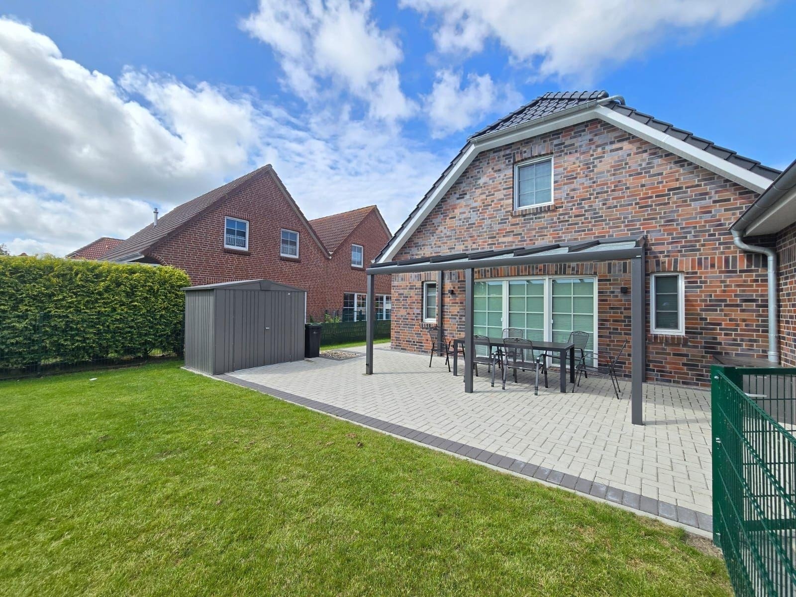 Das moderne Ferienhaus Friesenkate Backbord bietet einen einladenden Außenbereich, der ideal für Familien und Hundeliebhaber ist. Der komplett eingezäunte Garten sorgt für eine sichere Umgebung, in der Kinder und Hunde unbeschwert spielen können. Zwei separate Gartenbereiche stehen den jeweiligen Haushälften zur Verfügung, sodass Privatsphäre gewährleistet ist. Die großzügige Terrasse lädt dazu ein, die frische Luft zu genießen, sei es beim Frühstück in der Morgensonne oder einem entspannten Grillabend. Umgeben von malerischer Natur ermöglicht die Lage zahlreiche Aktivitäten im Freien, wie ausgedehnte Spaziergänge, Wanderungen und Fahrradtouren. Hier findet man den perfekten Rückzugsort, um sich vom Alltag zu erholen und die Ruhe der Umgebung in vollen Zügen zu genießen.