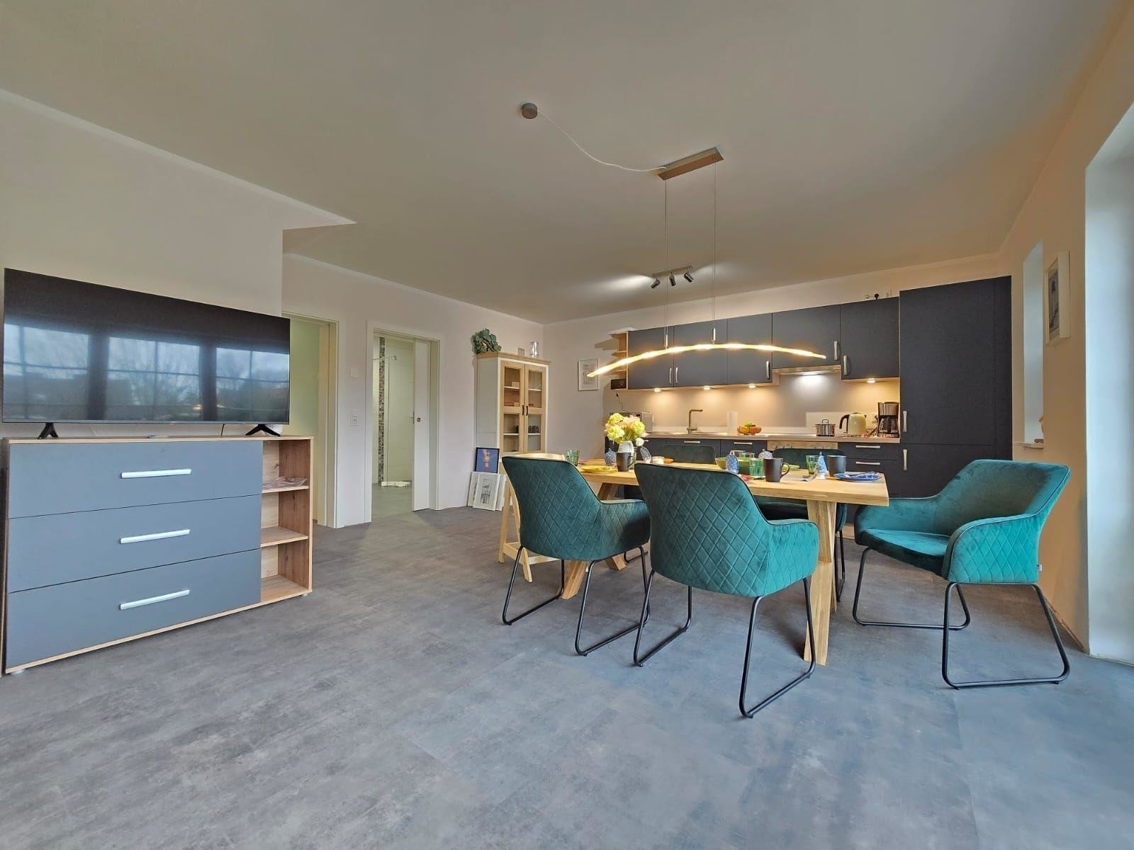 Das moderne Ferienhaus bietet Platz für bis zu sechs Personen und ist ideal für Familien sowie Hundebesitzer. Die offene Wohnküche ist vollständig ausgestattet mit Herd, Backofen, Kühlschrank, Mikrowelle, Geschirr und Kochutensilien, und verfügt über einen großzügigen Essbereich für gemeinsame Mahlzeiten. Das lichtdurchflutete Wohnzimmer ist mit bequemen Sofas und einem Flachbild-TV eingerichtet und lädt zum Entspannen ein. Drei geschmackvoll eingerichtete Schlafzimmer garantieren erholsame Nächte und ausreichend Stauraum. Ein GigaCube sorgt für Internetverbindung, jedoch ist das Streaming eingeschränkt. Bettwäsche und Handtücher sind auf Wunsch gegen Aufpreis verfügbar. Das Ferienhaus bietet eine ruhige Lage mitten in der Natur, ideal zum Entspannen und für Freizeitaktivitäten in der Umgebung.