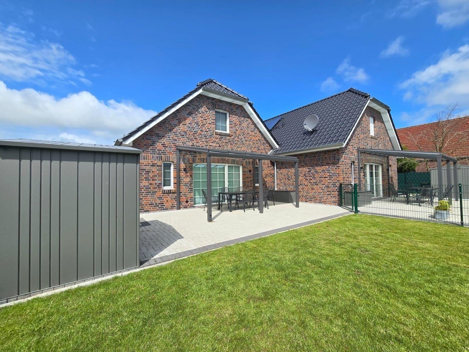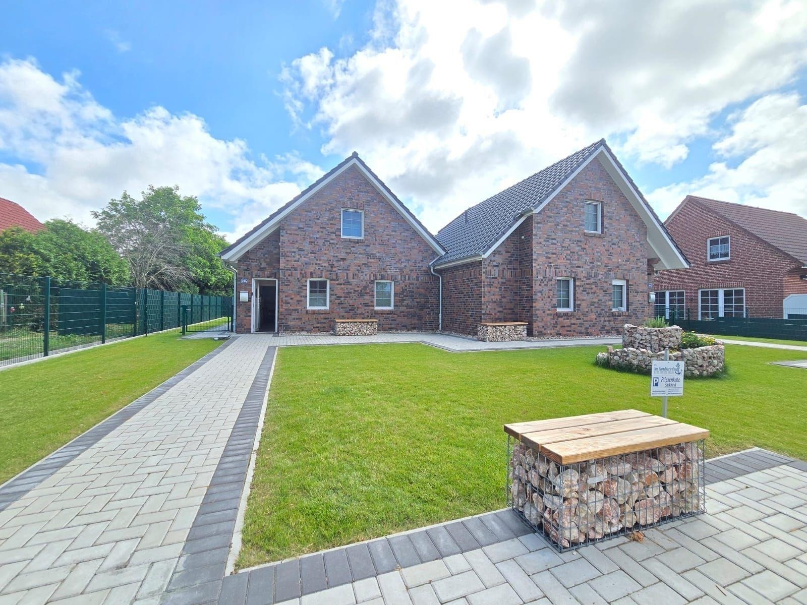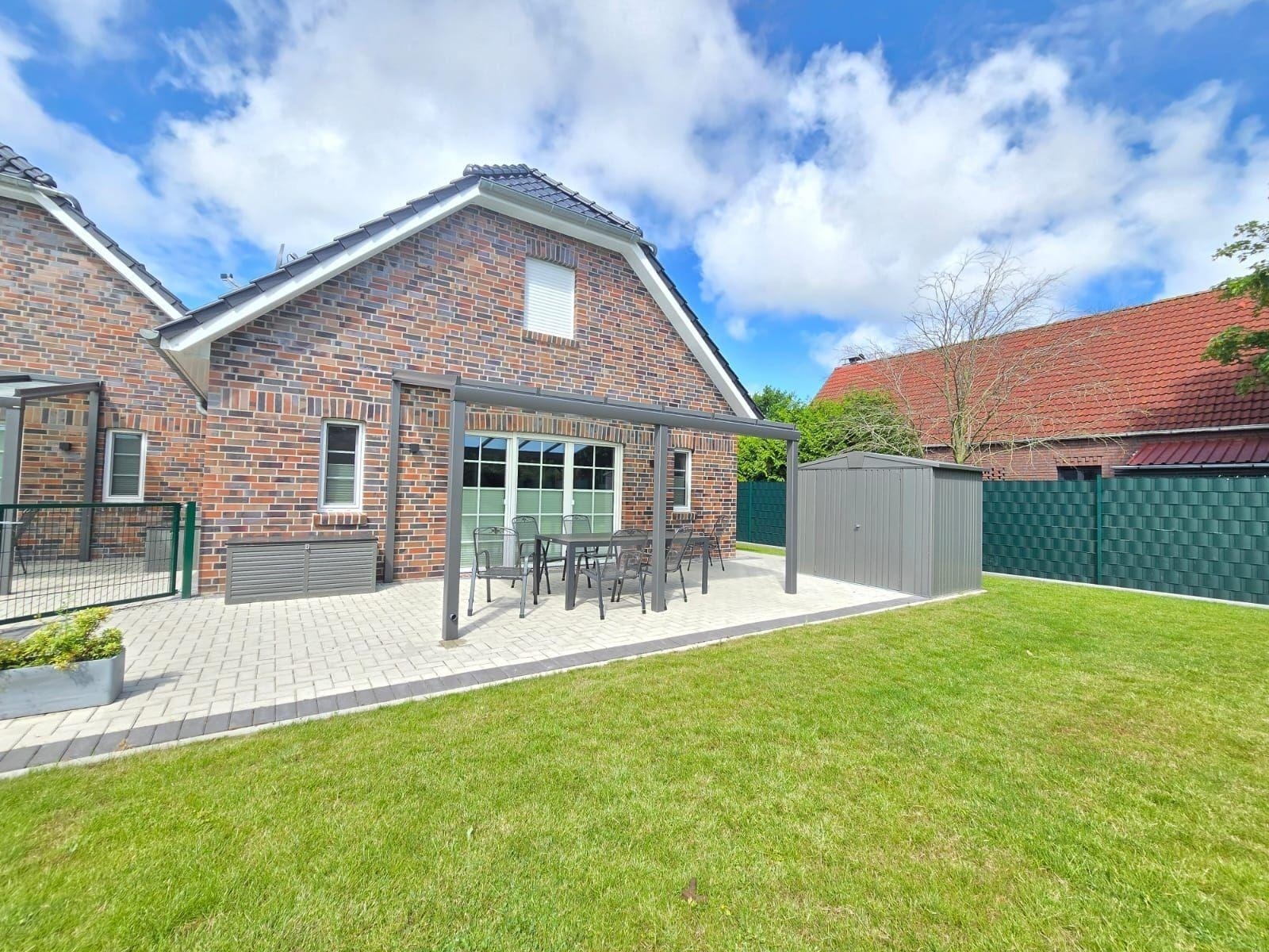 Das Ferienhaus Friesenkate Steuerbord bietet einen idyllischen Außenbereich, der Ruhe und Entspannung verspricht. Jede Haushälfte verfügt über einen eigenen, komplett eingezäunten Gartenbereich, ideal für Familien und Hundebesitzer. Die Terrasse lädt zum Verweilen in der Natur ein, ob beim Frühstück in der Morgensonne oder gemütlichen Grillabenden unter freiem Himmel. Die malerische Umgebung mit Wiesen und Feldern bietet zahlreiche Spazier- und Wanderwege, perfekt für Ausflüge. Die Lage ermöglicht es, die frische Landluft zu genießen und sich vom Alltagsstress zu erholen. Das Ferienhaus ist der ideale Rückzugsort für bis zu 6 Personen, die eine erholsame Zeit in der Natur verbringen möchten. Hier verbinden sich Komfort und Funktionalität, um eine unvergessliche Auszeit zu gewährleisten.