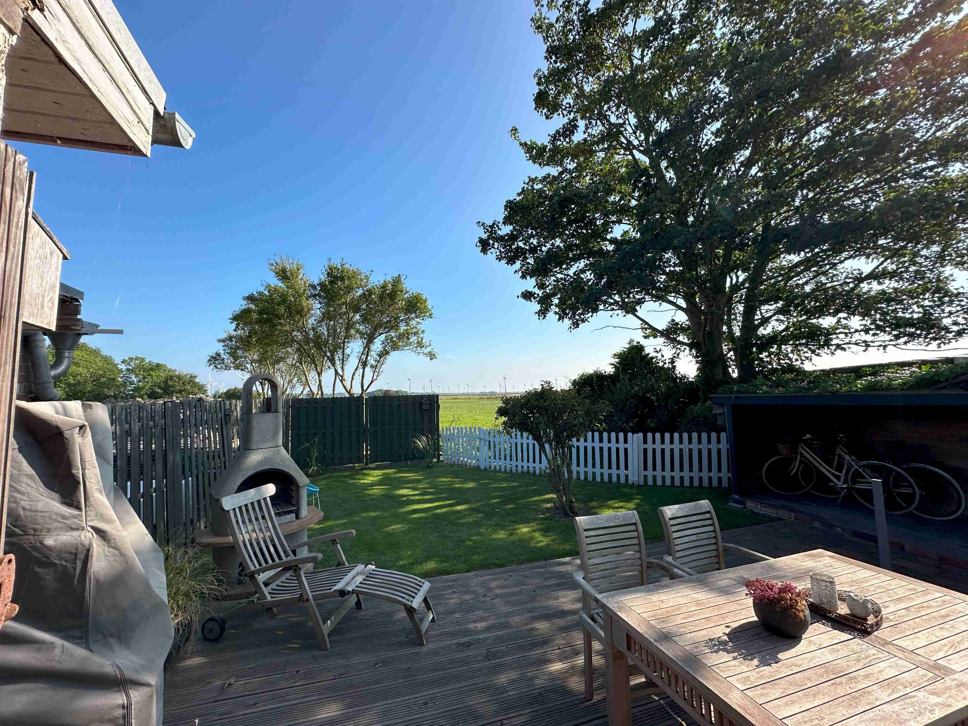 Die Terrasse führt in einen kleinen, gepflegten Garten mit weitem Blick. Zur Ausstattung gehören: