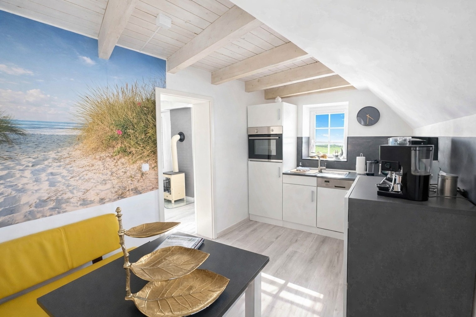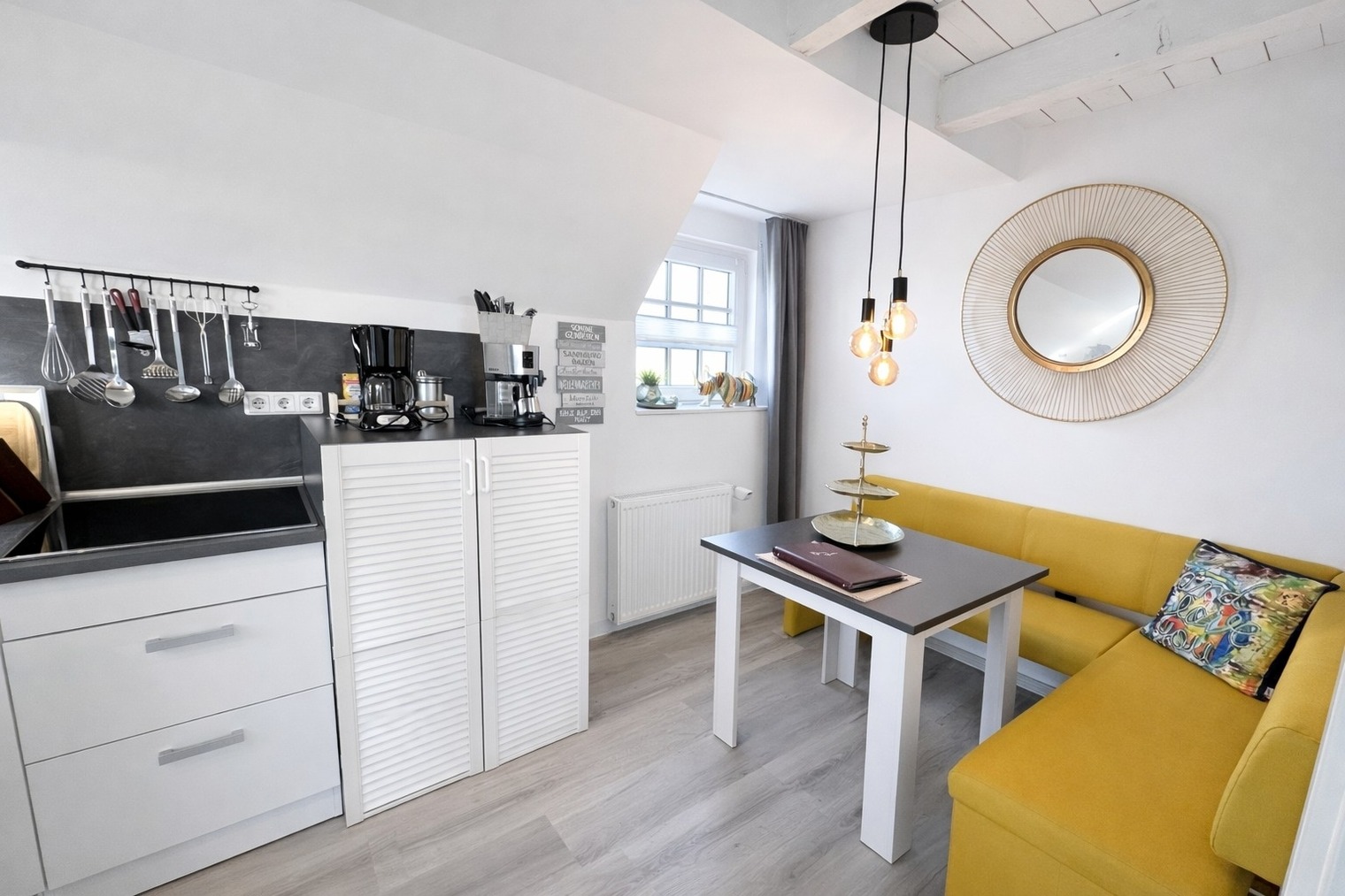 Auf der gemütlichen Eckbank frühstücken Sie mit Blick Richtung Deich – hier beginnt jeder Urlaubstag besonders schön.