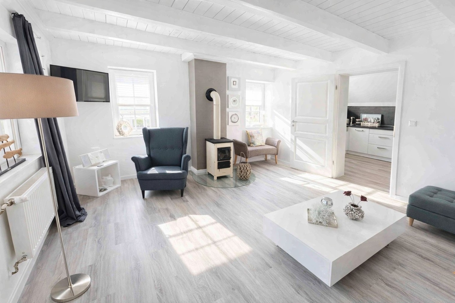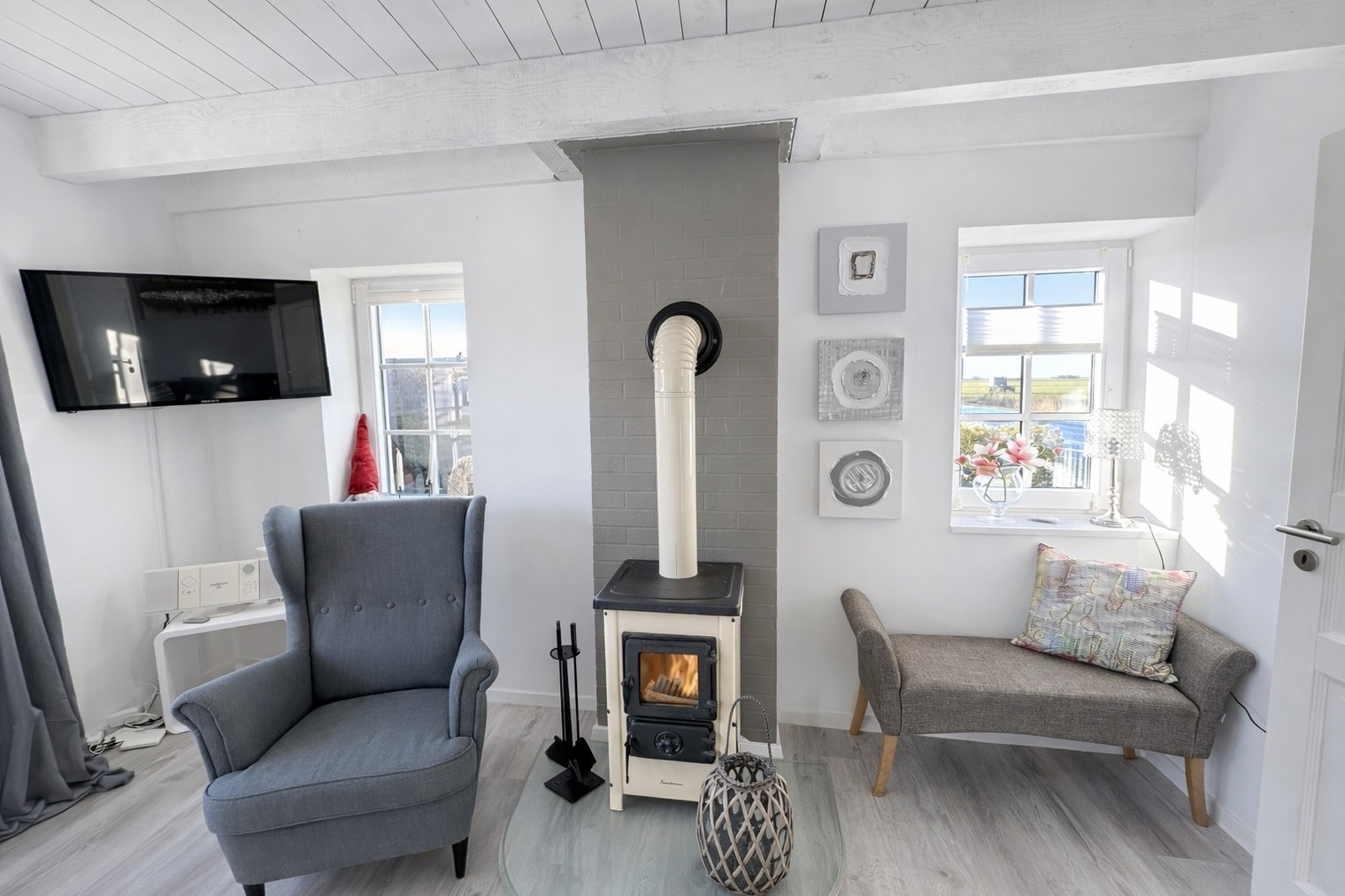 Das freundliche Wohnzimmer lädt mit kleiner Eckcouch, Smart-TV und einem Kaminofen (Holz bitte selbst mitbringen) zu entspannten Abenden ein. Von hier aus gelangen Sie direkt auf die Holzterrasse.