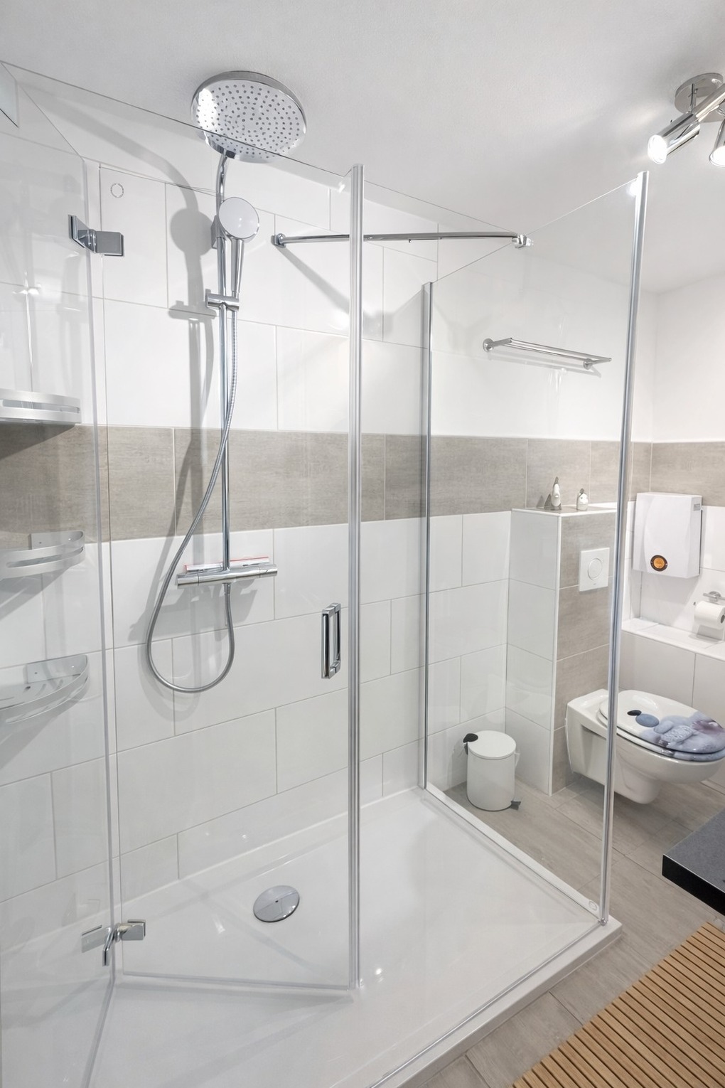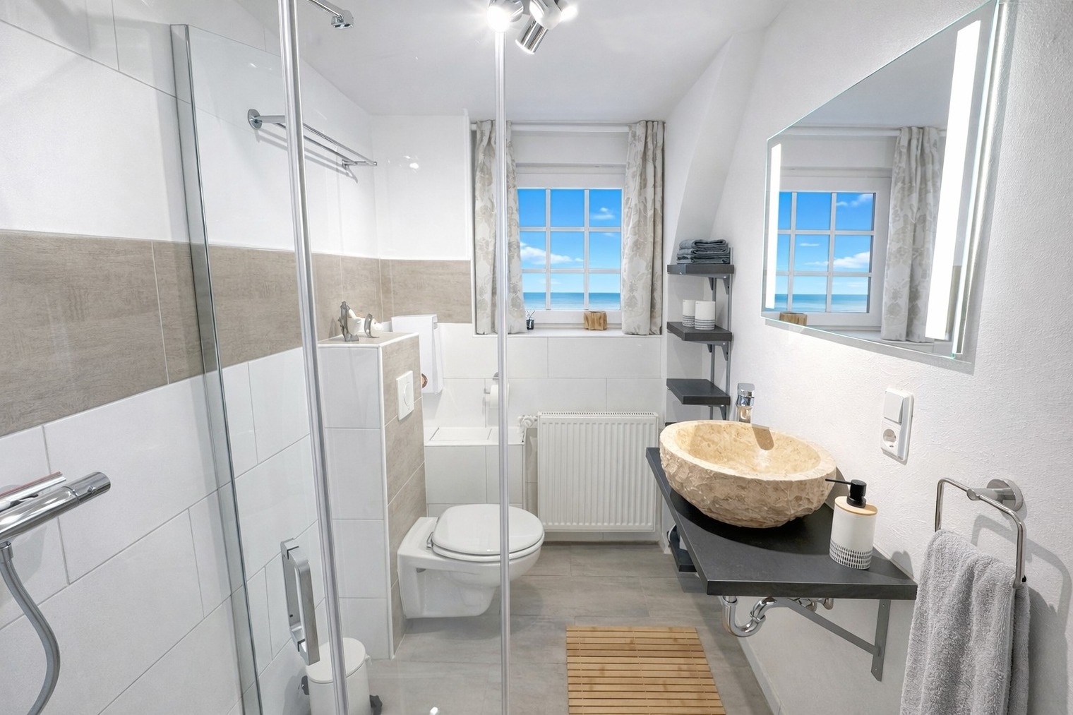 Das moderne Bad verfügt über eine bodentiefe Dusche mit Regendusche.
