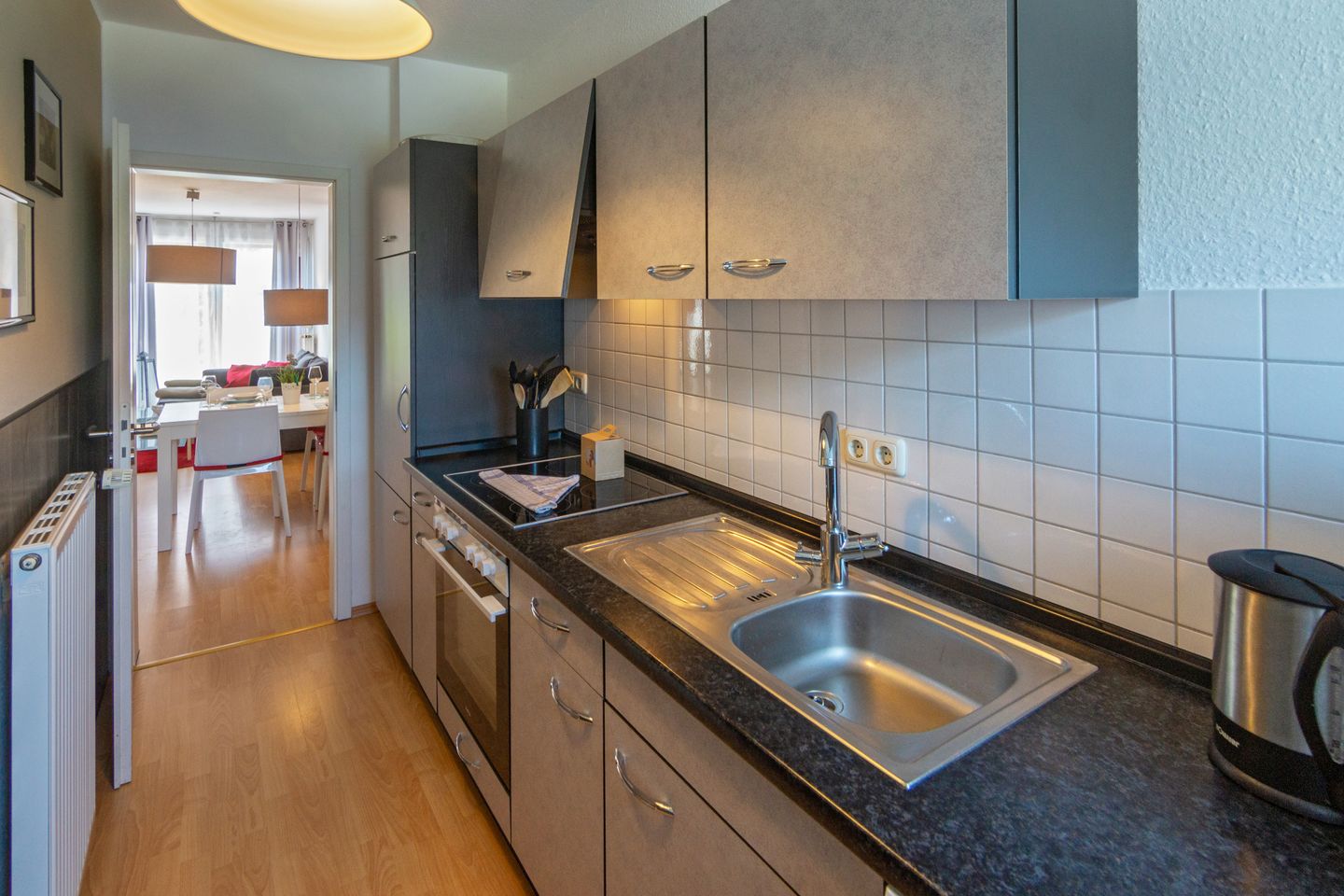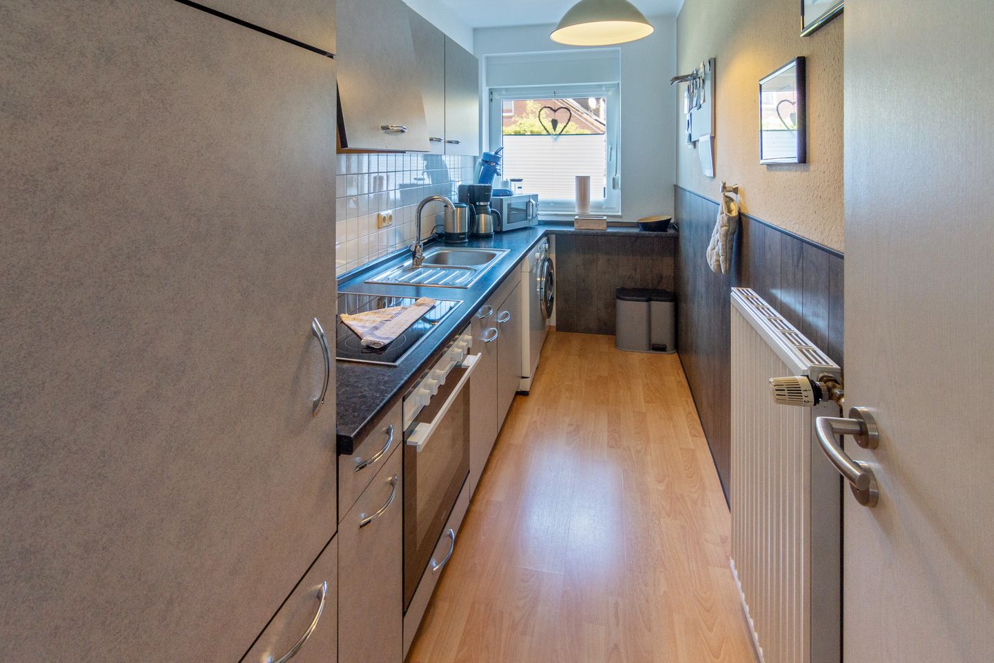 Die Unterkunft erstreckt sich über zwei Etagen und verfügt insgesamt über drei Zimmer, darunter zwei geschmackvoll eingerichtete Schlafzimmer mit Laminatfußboden. Das Erdgeschoss beherbergt einen lichtdurchfluteten Wohnbereich, in dem Sie auf einer komfortablen Couch die Zeit mit einem Film oder einer der bereitgestellten Spiele verbringen können. Ein Fernseher mit Satellitenanschluss sowie ein DVD-Spieler stehen Ihnen ebenfalls zur Verfügung. Der offen gestaltete Essbereich lädt zu gemeinsamen Mahlzeiten ein, während Sie die gut ausgestattete, geschlossene Küche mit modernen Geräten genießen können. Hier finden Sie alles, was Sie für die Zubereitung köstlicher Gerichte benötigen, einschließlich einer Cerankochstelle, einem Backofen, einer Spülmaschine und einer Senseo-Espressomaschine.