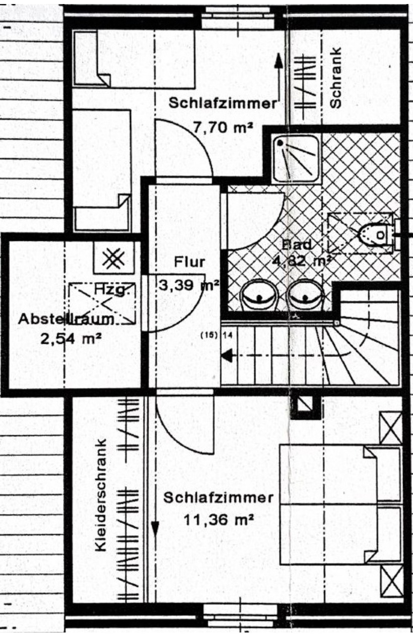 Vom Wohnzimmer aus, gelangen Sie über eine breite Metalltreppe in das ausgebaute Obergeschoss. Oben angekommen finden Sie zwei gemütliche Schlafzimmer mit Einbauschränken, sowie ein modernes Tageslichtbad mit Regendusche.