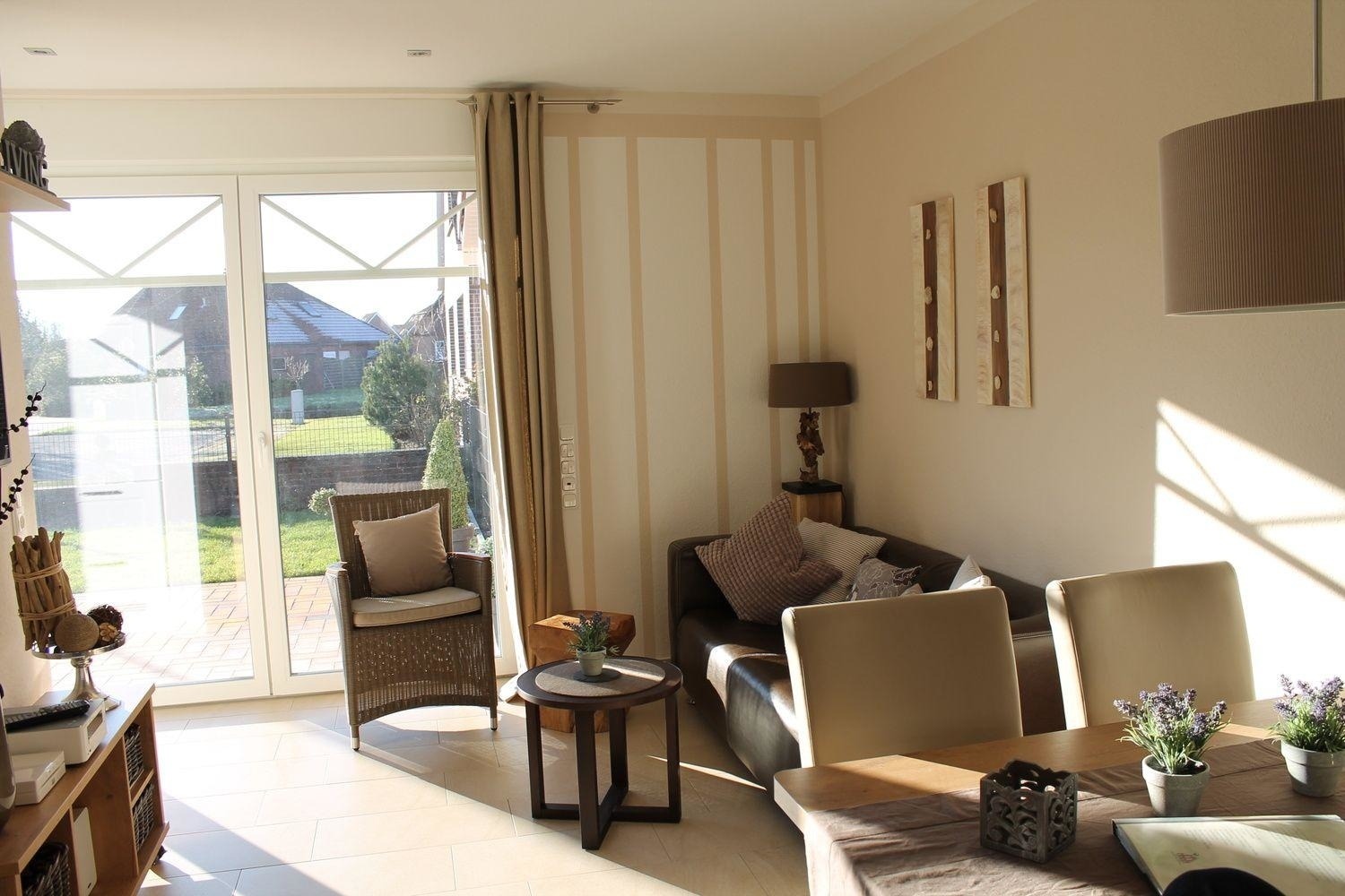 Es wurde Wert auf eine lichtdurchflutete Bauweise gelegt. Eine große sonnige Terrasse mit gemütlichen Gartenmöbeln, Sonnenschirm, gemütlichem Strandkorb laden zum Relaxen ein.