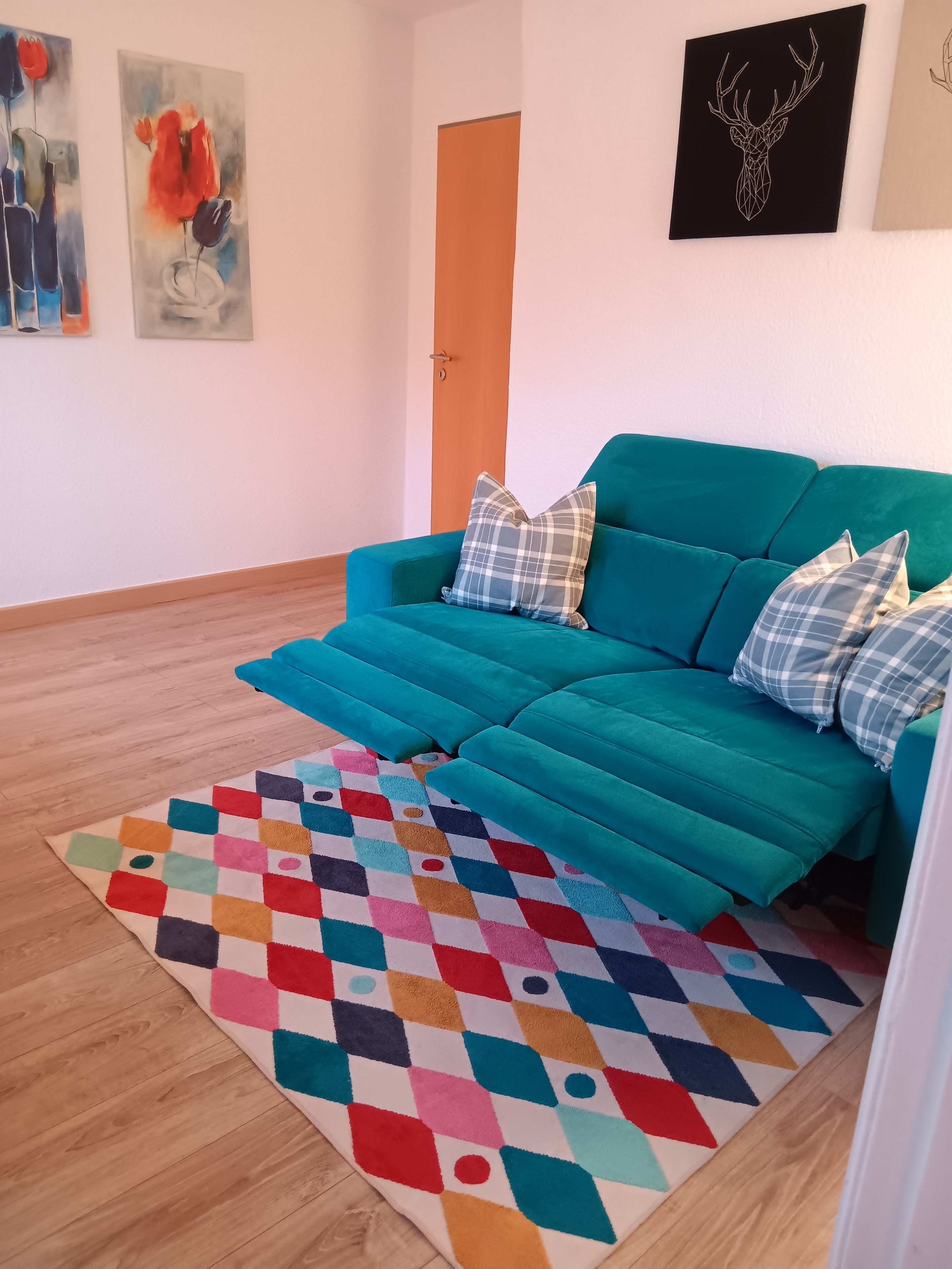Die Ferienwohnung bietet 3 Schlafplätze, ein großes Doppelbett 180 x 200 cm und eine bequeme Schlafcouch mit Topper im Wohnzimmer. Für die ganz kleinen Gäste kann auf Wunsch ein Kinderbett und Kinderstuhl zur Verfügung gestellt werden.