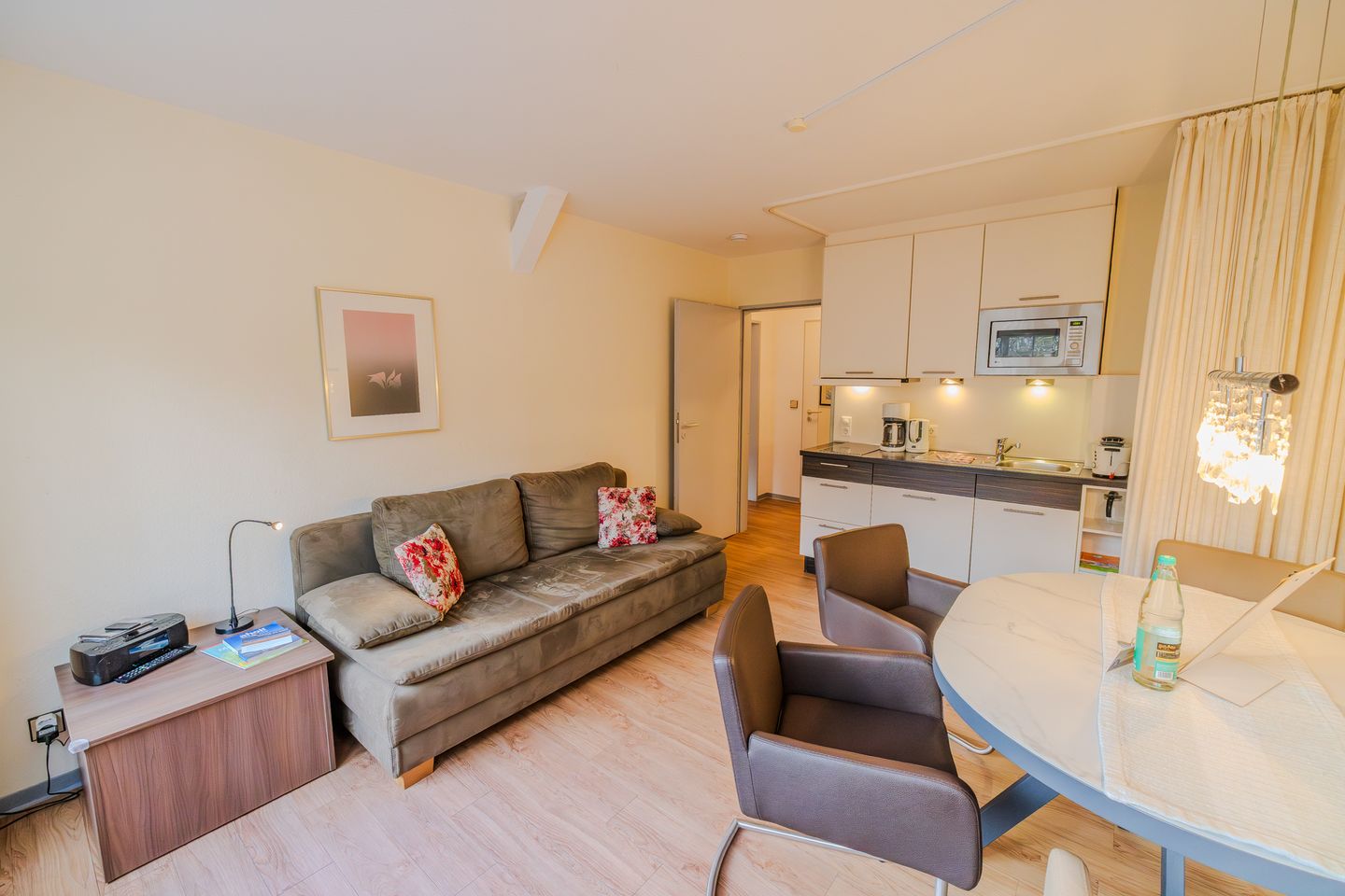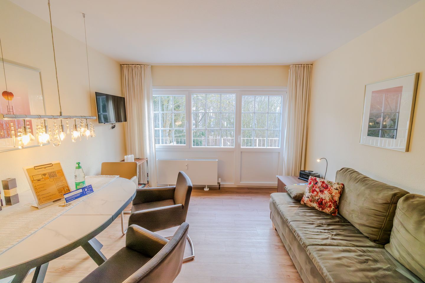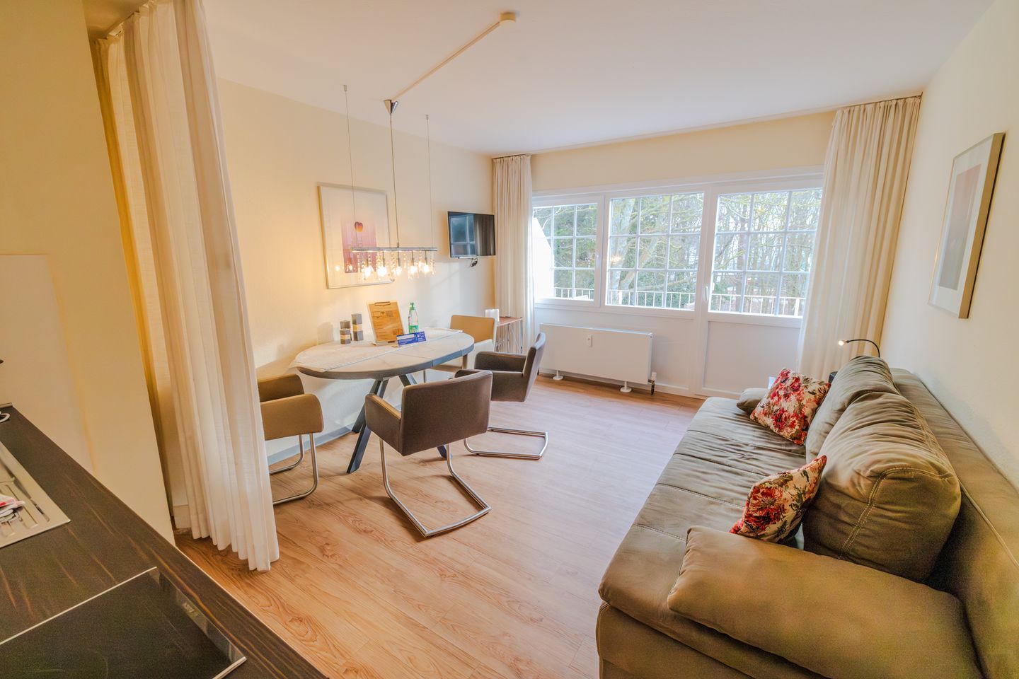 Die Wohnung ist geschmackvoll eingerichtet und verfügt über ein gemütliches Schlafzimmer mit einem komfortablen Bett (160x200cm), ein helles Wohnzimmer mit einem Sofa und einem Esstisch sowie eine offene Küche, die mit allen notwendigen Geräten ausgestattet ist. So können Sie sich ganz unkompliziert selbst verpflegen. Genießen Sie Ihre Mahlzeiten auf dem Balkon, wo Sie die frische Meeresbrise und den Blick ins Grüne erleben können.
