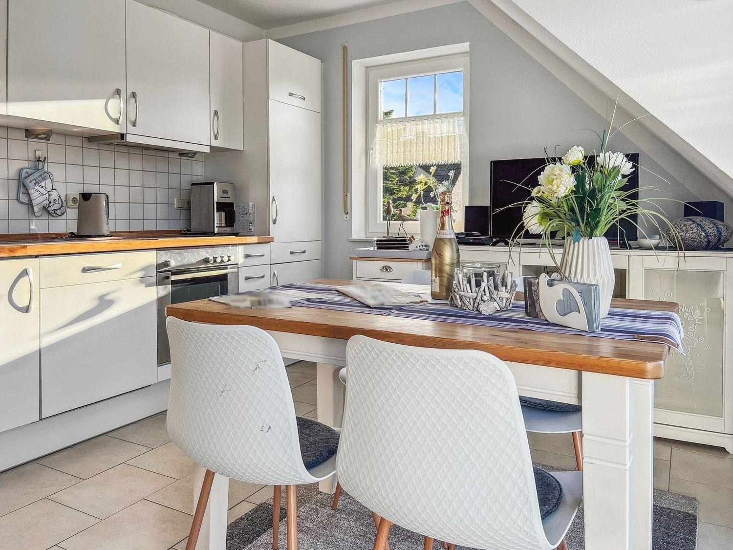 Auf 62 m² bietet die Obergeschosswohnung alles, was Sie für einen komfortablen Aufenthalt benötigen: eine offene Wohnküche im maritimen Stil, ein modernes Tageslicht-Badezimmer mit ebenerdiger Dusche und WC, ein Elternschlafzimmer auf der gleichen Etage mit Doppelbett (1,80 x 2,00 m) und TV sowie einen praktischen Abstellraum.