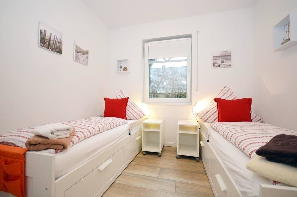 Im zweiten Schlafzimmer befinden sich zwei bequeme Einzelbetten (je 2,00 m x 0,80 m) und ein praktisch aufgeteilter Schrank; zusätzlicher Stauraum wird durch die geräumigen Bettschubladen geschaffen.