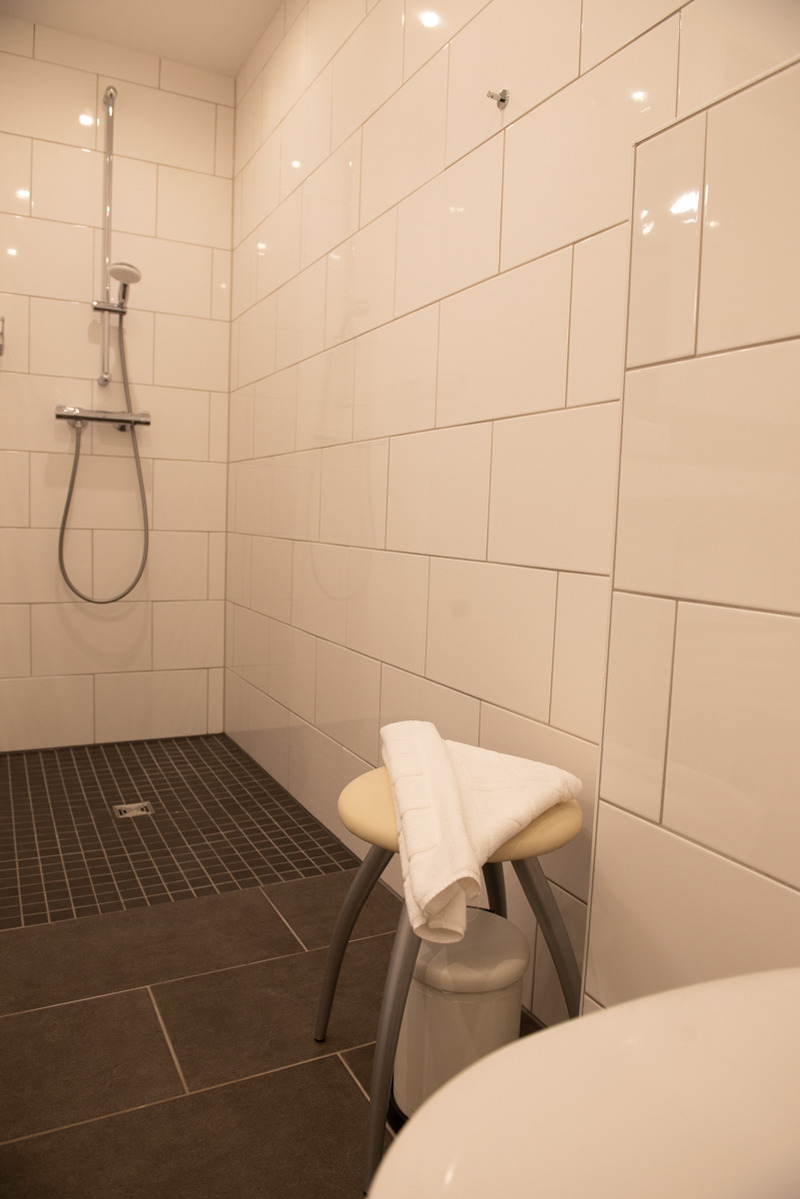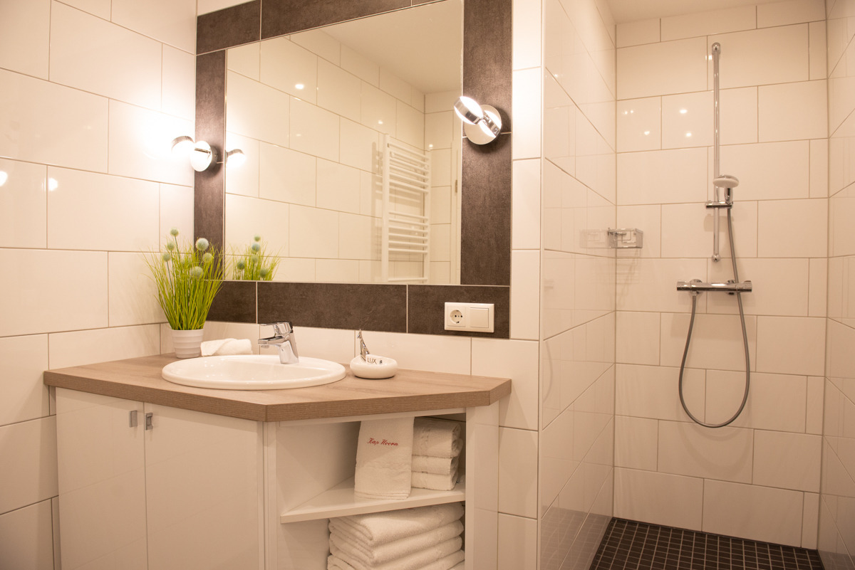Das moderne Bad/ WC ist mit einer bodenebenen Dusche und einem Einbau -Waschtisch mit großem Spiegel ausgestattet.