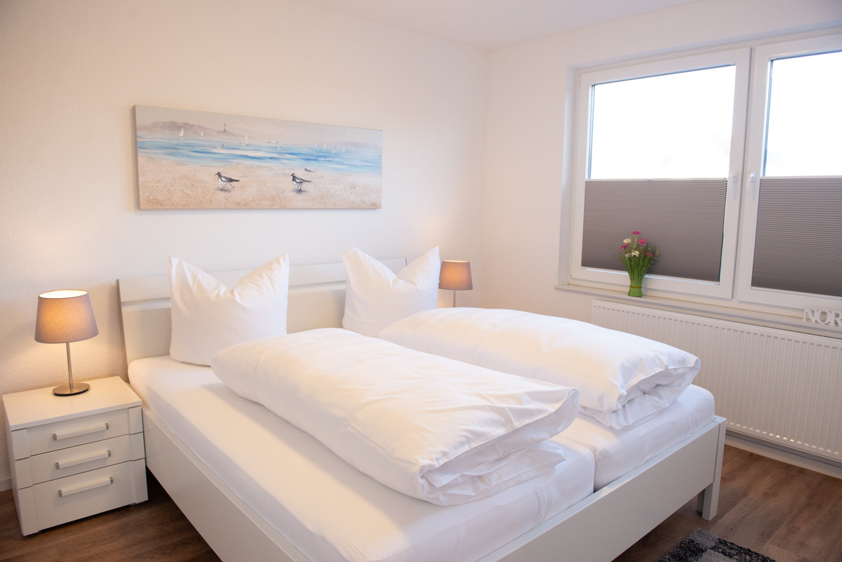 Die Wohnung besitzt ein Schlafzimmer, welches mit einem Doppelbett, Fernseher Sat/TV und Verdunklungsplissees ausgestattet ist.