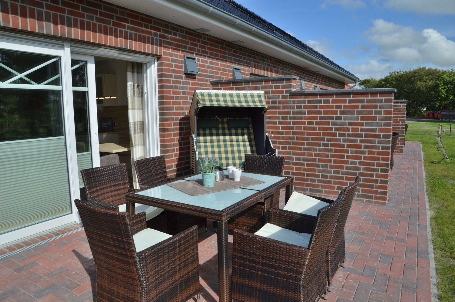 Auf der Terrasse warten bereits gemütliche Rattangartenmöbel, ein Strandkorb, ein Holzkohlegrill und ein Sonnenschirm auf Sie.