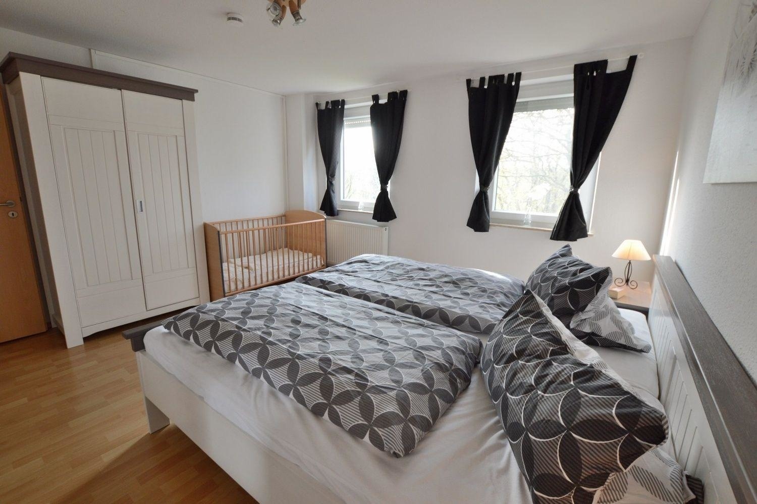 Ein Kindergitterbett aus Holz steht im Elternschlafzimmer.