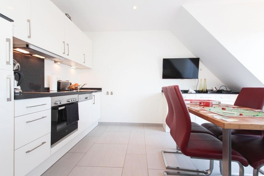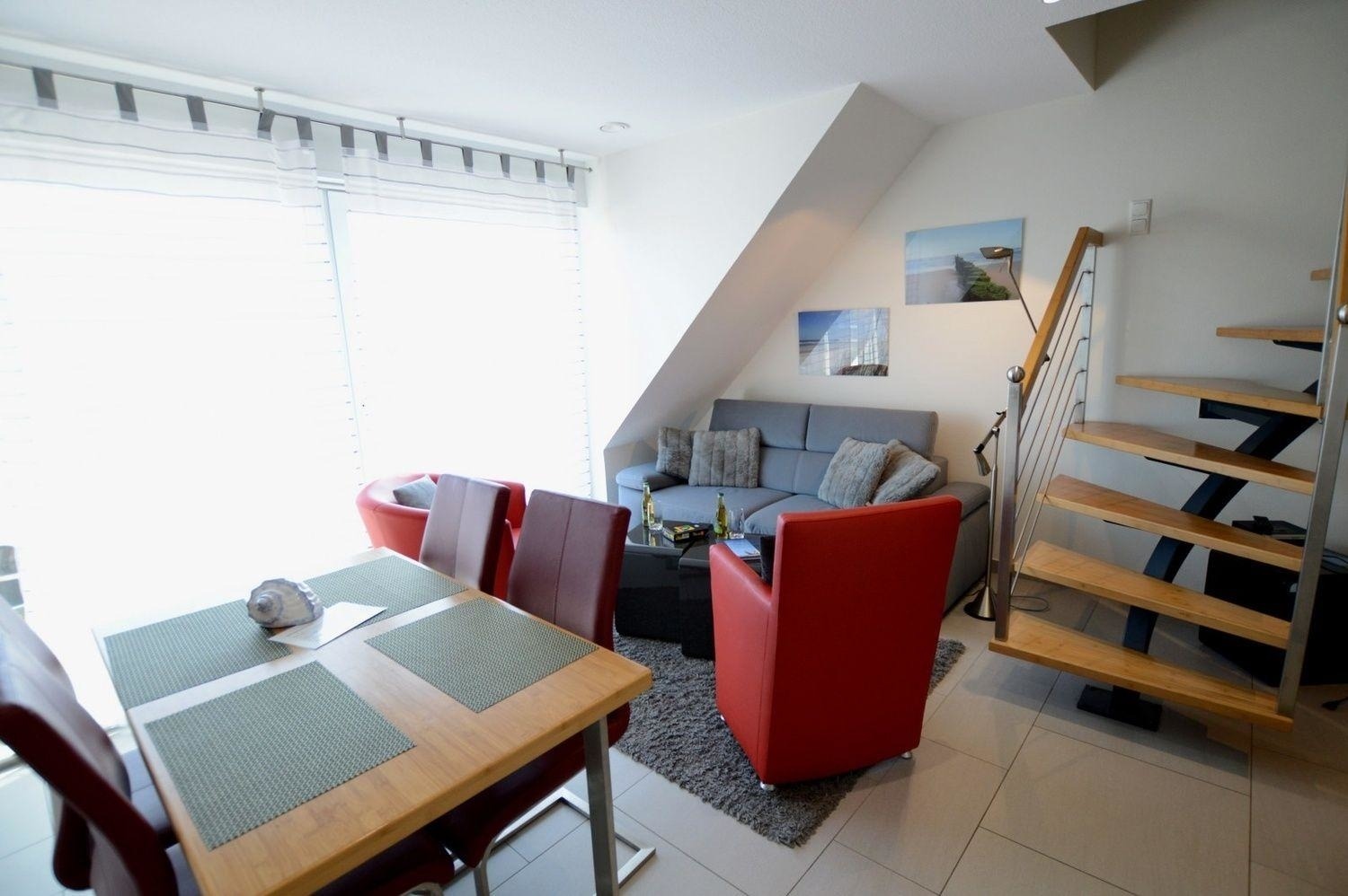Wir heissen Sie herzlich willkommen in der Strandzeit II, einer modernen und eleganten Wohnung mit ca 62 qm Wohnfläche. Das rote Ledersofa mit Sessel erwartet Sie schon für gemütliche Abendstunden. Für die Unterhaltung sorgen ein Flachbildschirm-TV, ein Blue ray-Player und eine Musikanlage mit CD und Dockingstation für iPod und iPhone.