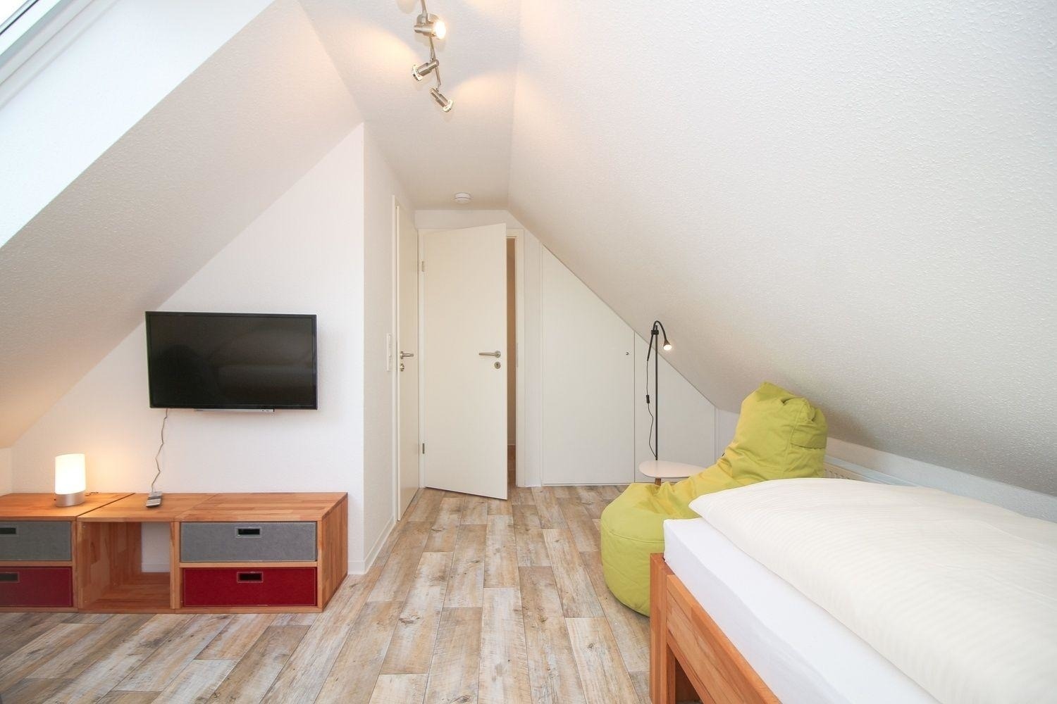 Über die Treppe im Eingangsbereich erreichen Sie im Obergeschoss ein weiteres Schlafzimmer mit zwei Einzelbetten. Der durch die zwei großen Fenster ausgesprochen helle Raum lädt mit seinen gemütlichen Sitzsäcken auch tagsüber zum Verweilen ein.