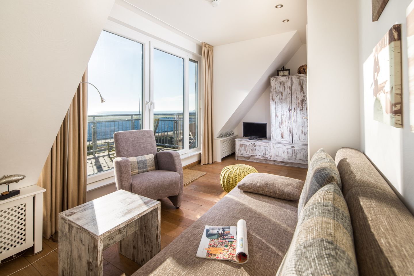… von den zwei Südbalkonen mit herrlichem, uneingeschränkten Blick über das Wattenmeer bis aufs Festland! Luxusambiente in Spitzenlage (ruhig gelegen und doch nur wenige Schritte in den Ortskern oder zum Strand) erwarten Sie in dem knapp 80qm großen, hochwertig und geschmackvoll eingerichteten Feriendomizil. Im ersten Stock befindet sich das komfortable, sonnendurchflutete Wohn-Esszimmer mit Flat-Kabel-TV, CD/Radio/DVD-Anlage, W-LAN und großer DVD- und Spielesammlung, sowie eine separate, moderne Markenküche (Mikrowelle, Ceranfeld, Spülmaschine, Jura-Kaffee-Vollautomat, Nespresso Kaffeemaschine, klassische Filterkaffemaschine, Waffeleisen, Heißluftfriteuse) und das Bad mit ebenerdiger Dusche, Waschmaschine und Trockner.