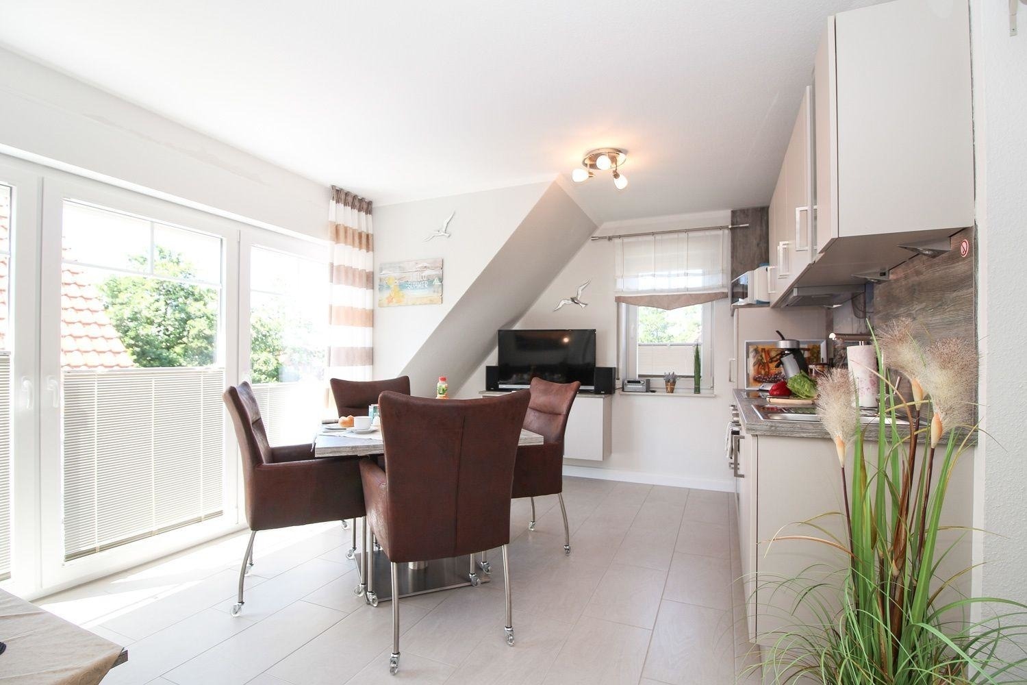Der Wohn- und Essbereich ist wie der Rest der Wohnung in Weiß- und Naturtöne abgestimmt und verströmt ein frisches Flair. Der Wohnbereich mit bequemer brauner Ledercouch und Sessel sowie der Essbereich ist für 4 Personen ausgelegt. Für seichte Unterhaltung trägt ein großer TV-Flachbildschirm und ein Radio bei.