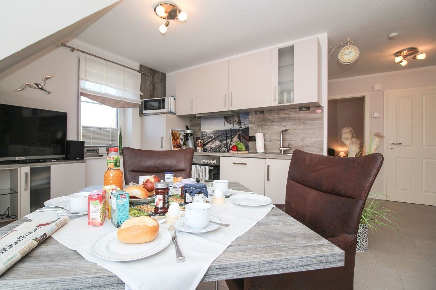 Die schöne Einbauküche verfügt über Annehmlichkeiten wie Herd mit Ceranfeld und Backofen, Geschirrspüler, Kühlschrank, Mikrowelle, Wasserkocher, Eierkocher, Toaster sowie eine Senseomaschine/Pad für den Kaffeegenuss.