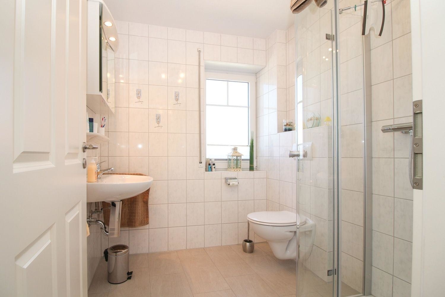 Munter werden Sie im tageshellen Bad mit Dusche/niedriger Einstieg, Waschbecken, Spiegel und WC.
