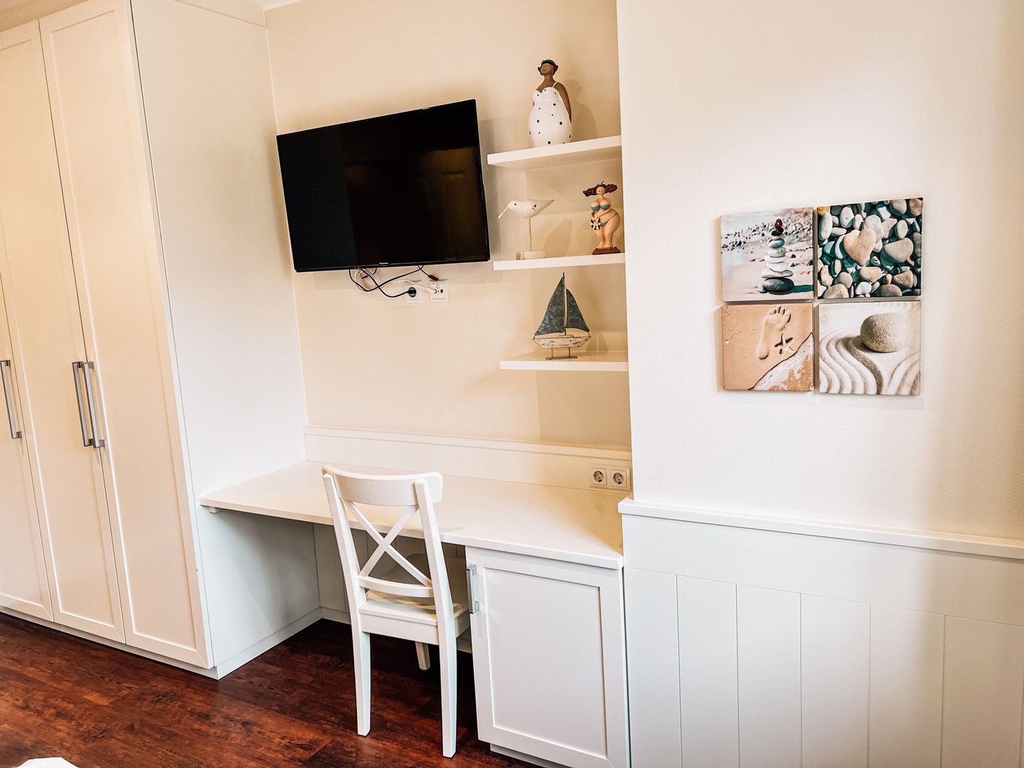 Schlafzimmer: Ein Elternschlafzimmer mit Doppelbett und Flachbild-TV sowie ein Kinderschlafzimmer mit zwei Einzelbetten, Flachbild-TV und DVD-Player.