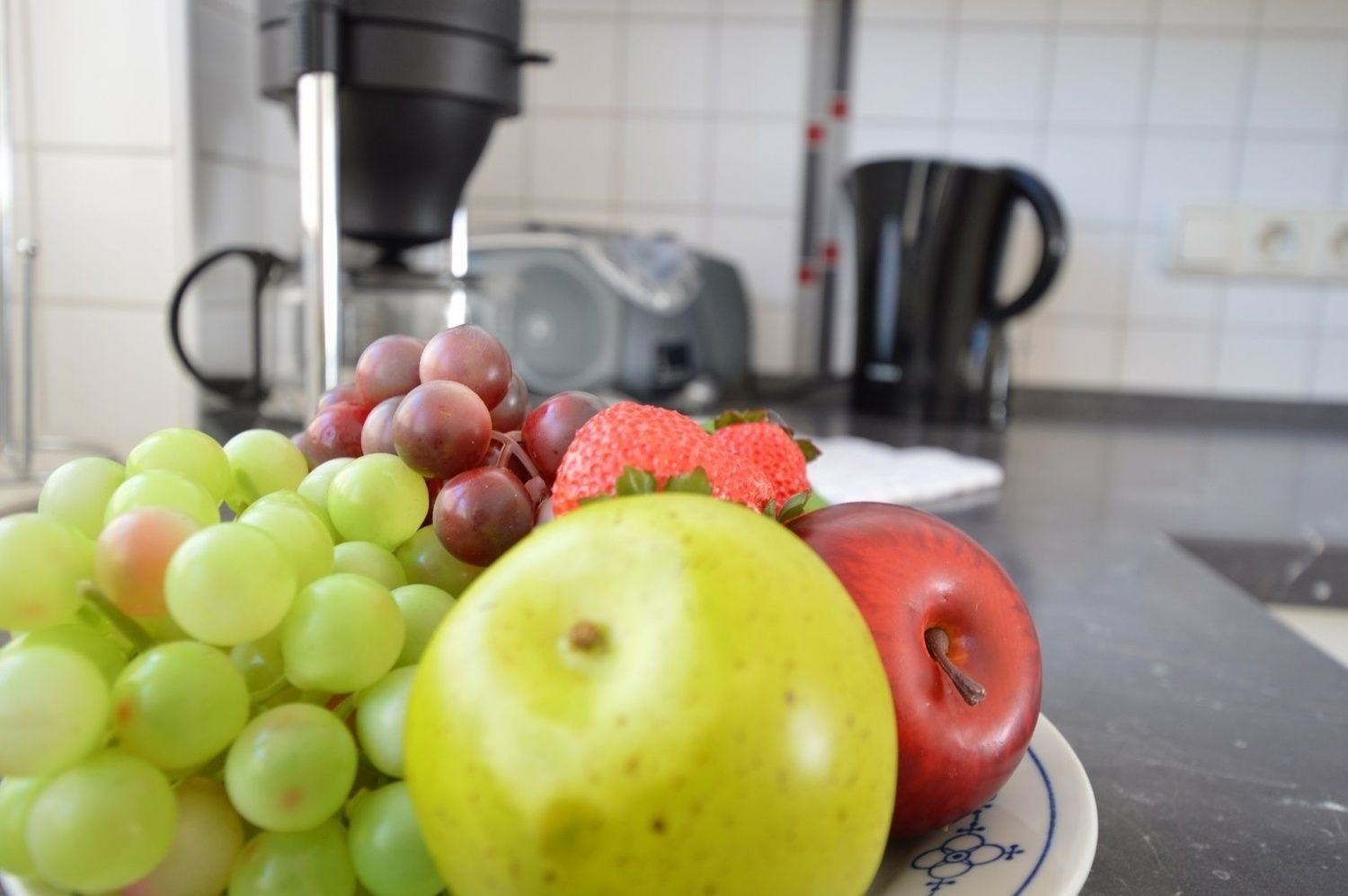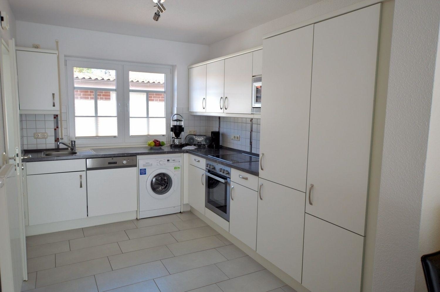 Im EG befinden sich ein Gäste-WC und eine große Wohnküche. In der neuen Einbauküche finden Sie alles was das Herz begehrt. Eine Mikrowelle, Herd mit Ceranfeld, Backofen, Kühlschrank, Gefrierschrank, Geschirrspüler, Waschmaschine, Toaster, Kaffeemaschine/Filtergröße 2, Eierkocher, Wasserkocher sowie ausreichend Koch- und Essgeschirr. Der Küchenbereich schließt mit einem Esstisch mit vier Stühlen ab.