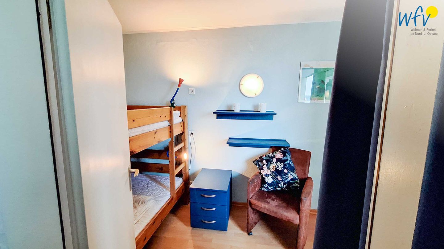 Die Borkumer Ferienwohnung verfügt über einen Wohn-/Schlafraum mit einem komfortablen Boxspringbett für zwei Personen. In dem separaten Schlafzimmer befinden sich ein Etagenbett, ein Kleiderschrank und ein Nachtschrank. Schlafmöglichkeiten für eine weitere Person bestehen durch das Schlafsofa.