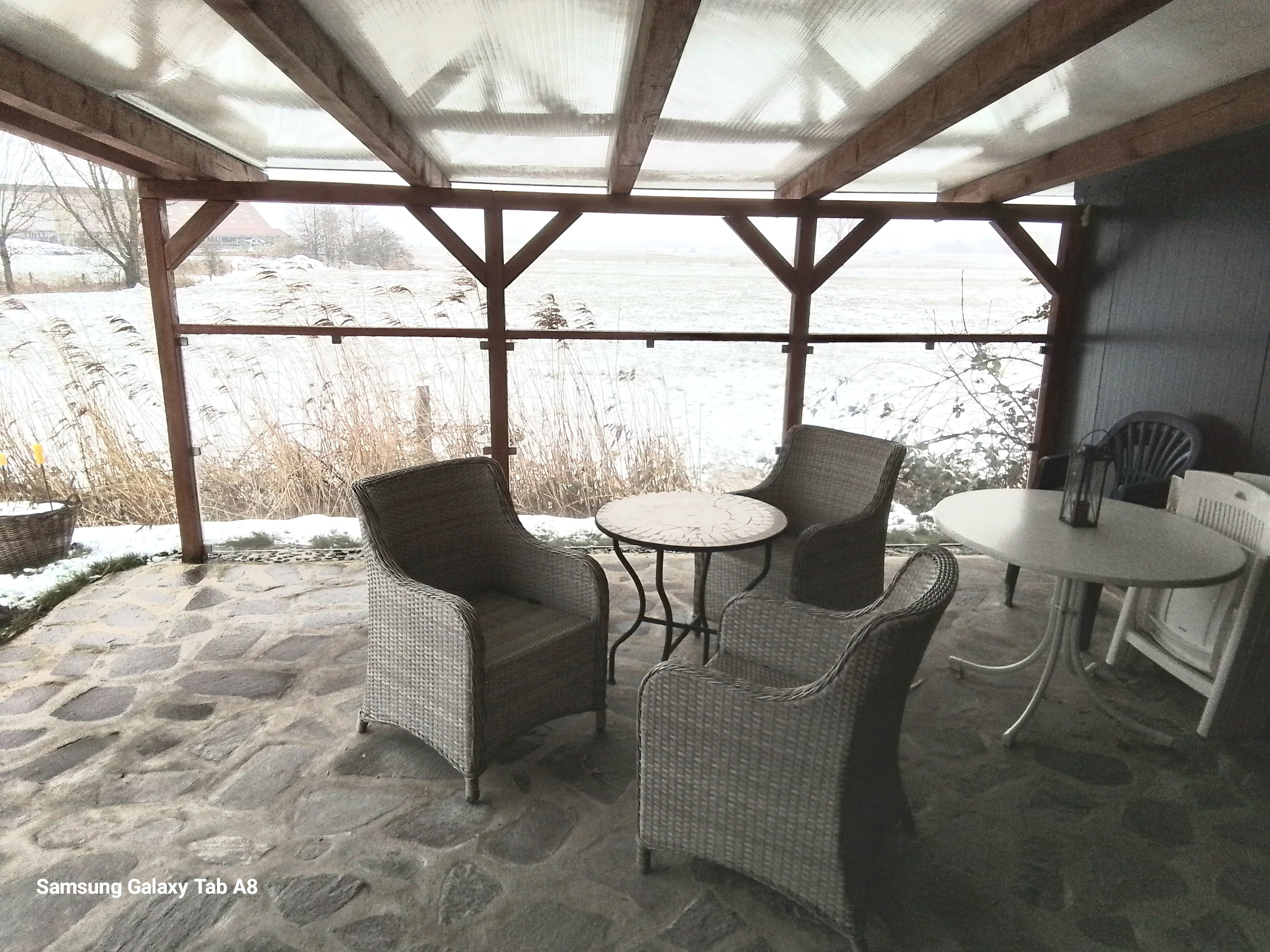 Eine überdachte Terrasse mit Windschutz und Terrassenmöbel sowie einem Grill laden auch bei Regen zum Verweilen ein.