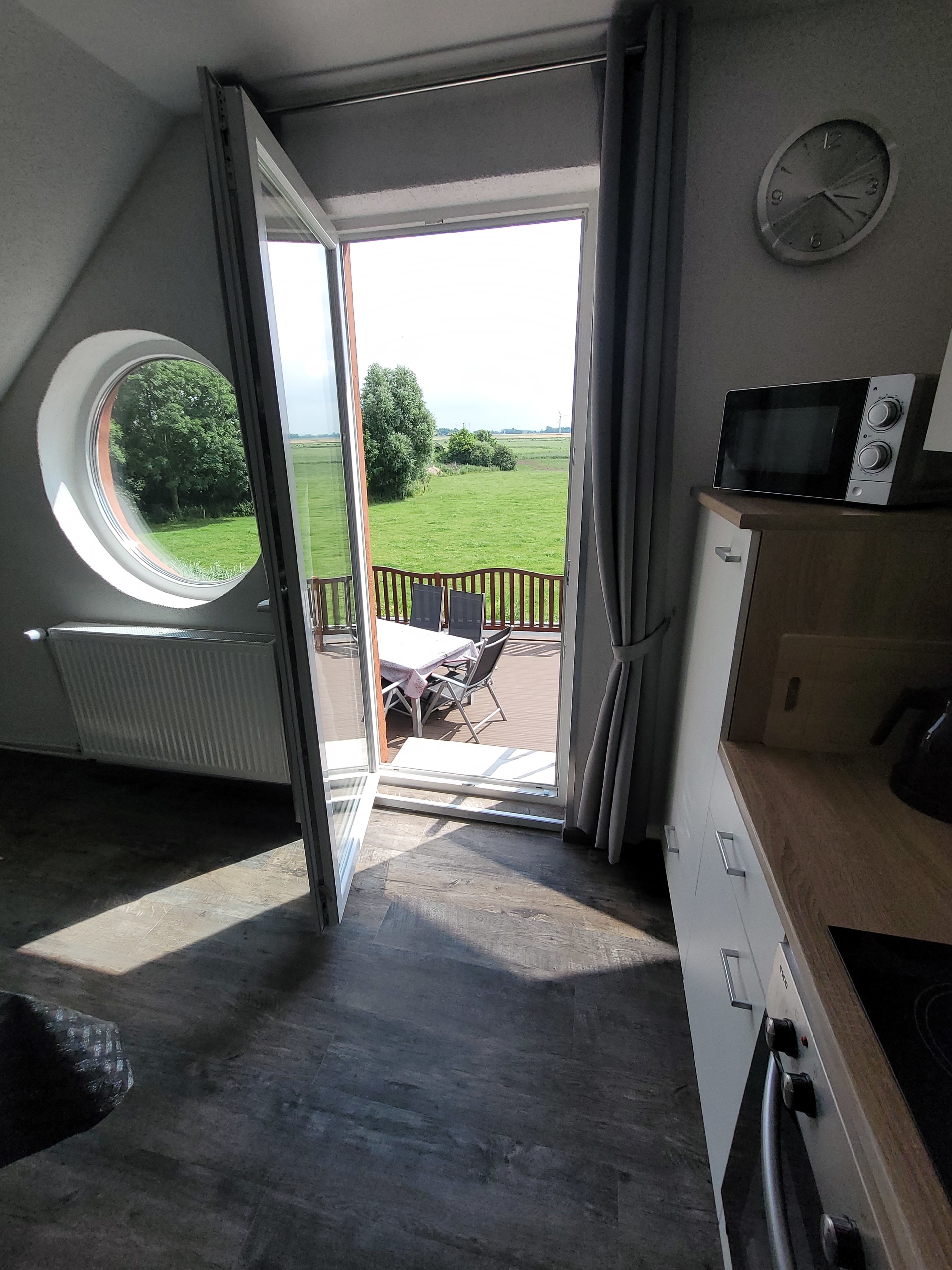 Von dem Küchenbereich führt eine Treppe auf eine möblierte Terrasse mit herrlichem Wiesenblick.