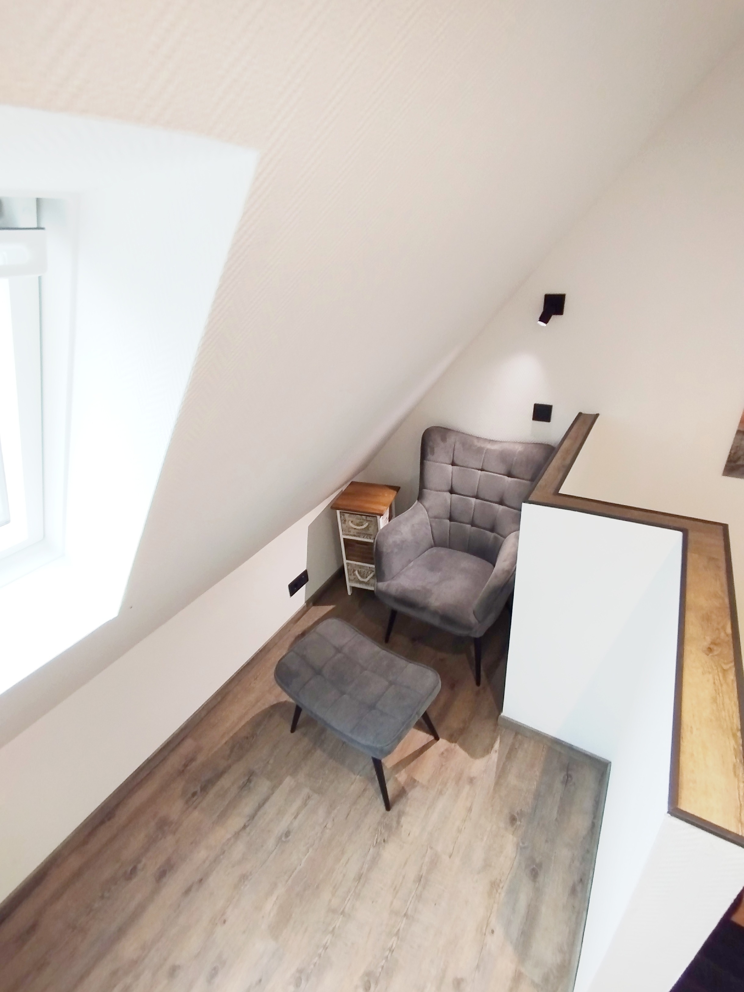 Die Wohnung ist wie folgt aufgeteilt. Wohnraum mit Küchenzeile (Toaster, Wasserkocher, Filter Kaffeemaschine, Kühlschrank mit Eisfach), Sitzgelegenheiten und einem Sofa mit Schlaffunktion, Badezimmer mit Dusche/WC und ein separater Schlafraum mit einem 180*200 Boxspringbett. Über eine Treppe erreichen Sie ein weiteren gemütlichen, offenen Raum der eine weitere Schlafmöglichkeit 160*200 für 2 Personen bietet und mit seinem besonderen Charme vor allem bei Kindern und Junggebliebenen beliebt ist..