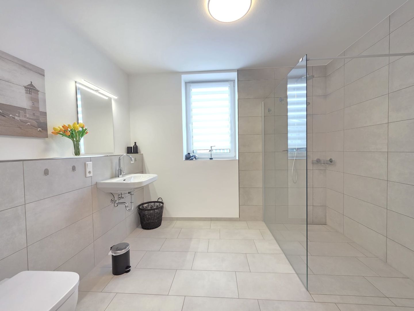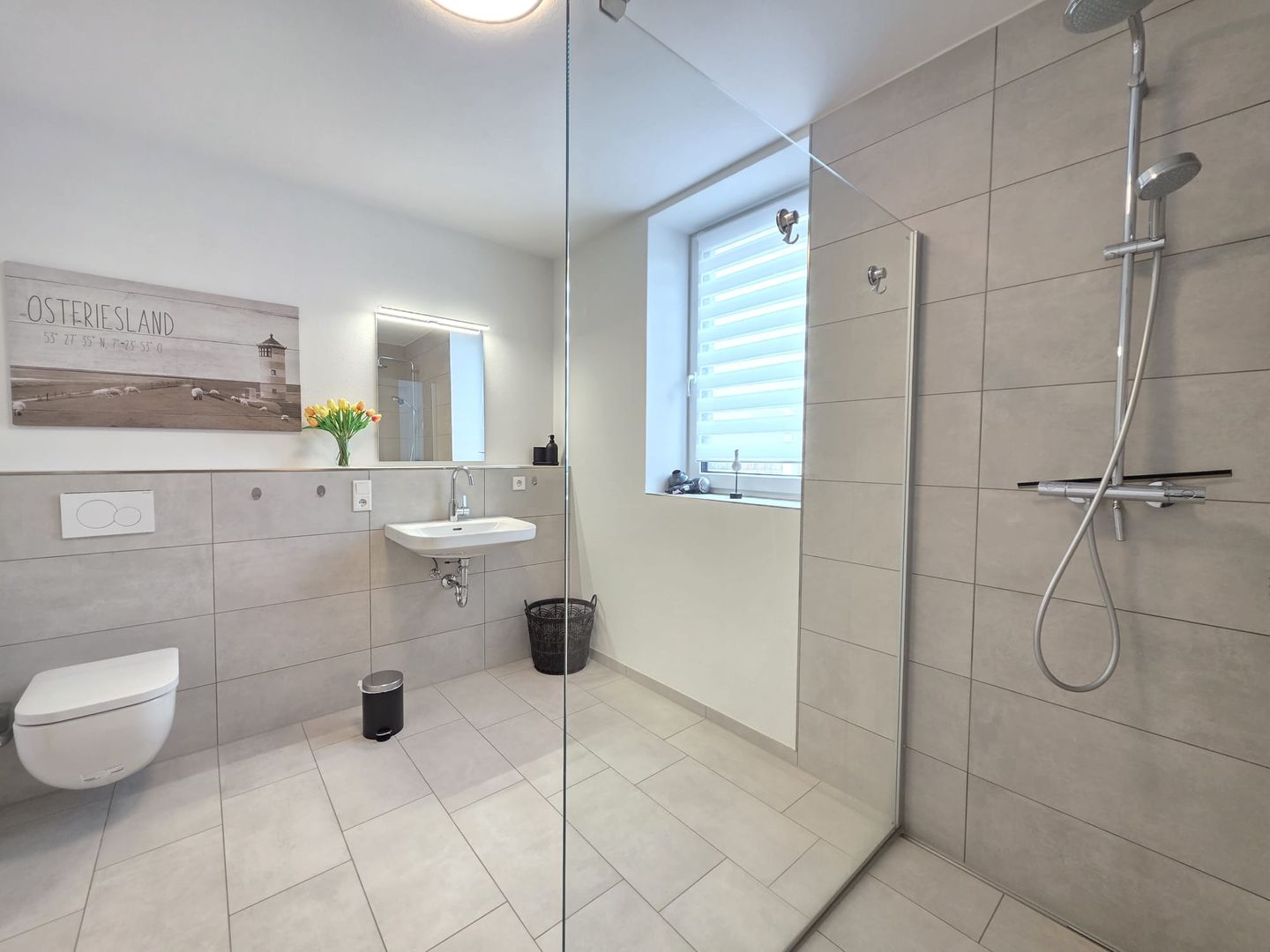 Das elegante Badezimmer verfügt über eine moderne Dusche, ein WC und einen Handtuchwärmer. Zusätzlich ist ein Gäste-WC vorhanden, was besonders für den Aufenthalt zu viert praktisch ist.