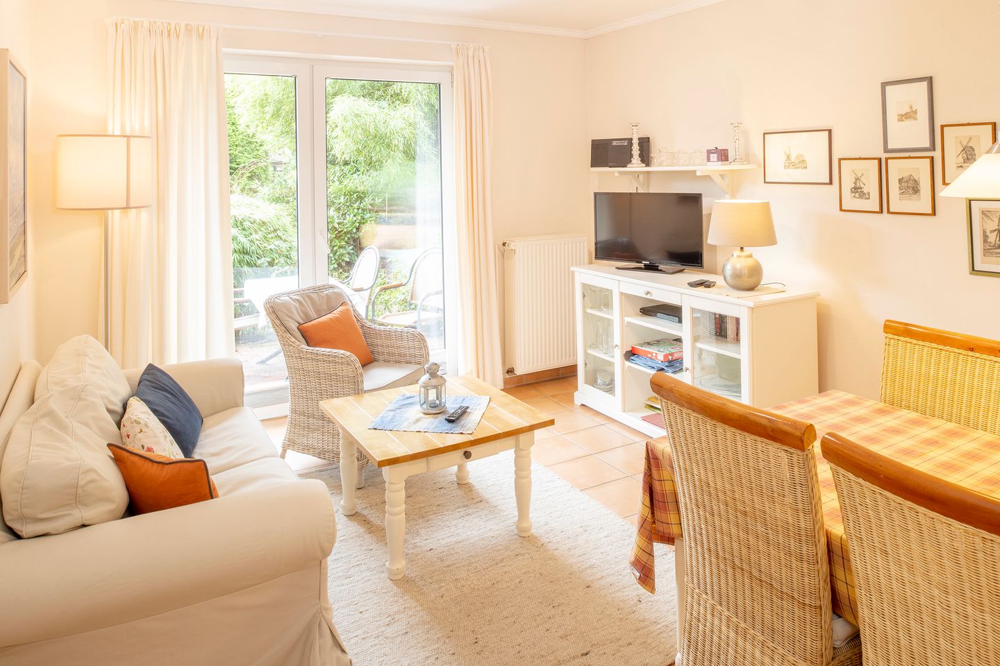 Im Wohnbereich schaffen Sofa und Sessel eine angenehme Atmosphäre für entspannte Stunden. Ein TV sowie WLAN und Internet gehören ebenfalls zur Ausstattung. Die Zentralheizung sorgt auch an kühleren Tagen für ein angenehmes Wohnklima. Sichtschutz an allen Fenstern unterstützt Ihre Privatsphäre. Die Böden im Wohnzimmer sind mit Fliesen ausgestattet.