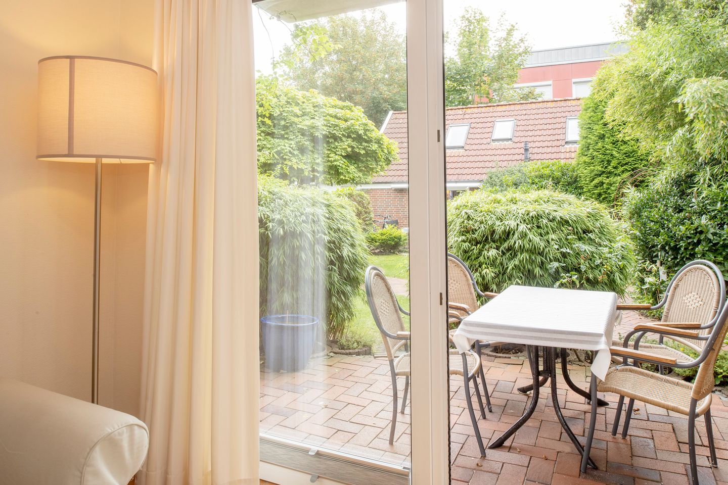 Im Außenbereich lädt eine überdachte Terrasse mit Gartenmöbeln, Sonnenschirm und Strandkorb zum Verweilen ein. Für längere Aufenthalte oder den Familienurlaub sind auch praktische Ausstattungsmerkmale vorhanden, darunter Garderobe, Kommode, Staubsauger sowie eine gemeinschaftlich nutzbare Waschmaschine und ein gemeinschaftlich nutzbarer Trockner.