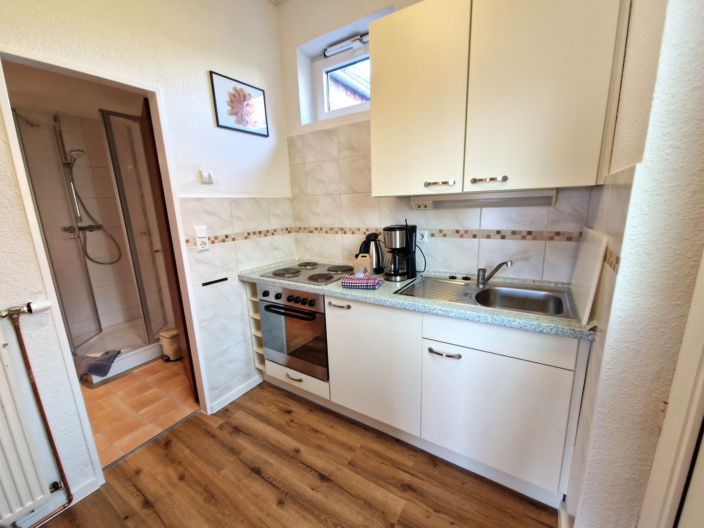 Das Apartment verfügt über ein Wohn-/Schlafzimmer, eine Küchenzeile sowie ein Bad mit Dusche und Fenster.