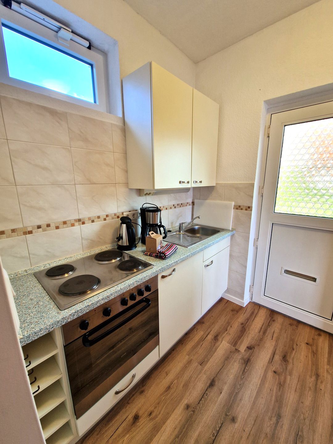 Ausgestattet ist die Küche mit einem 4 Platten Herd und einem Backofen.