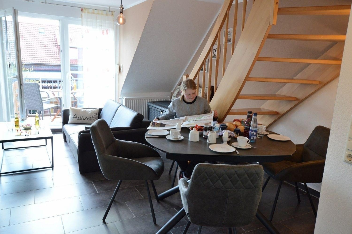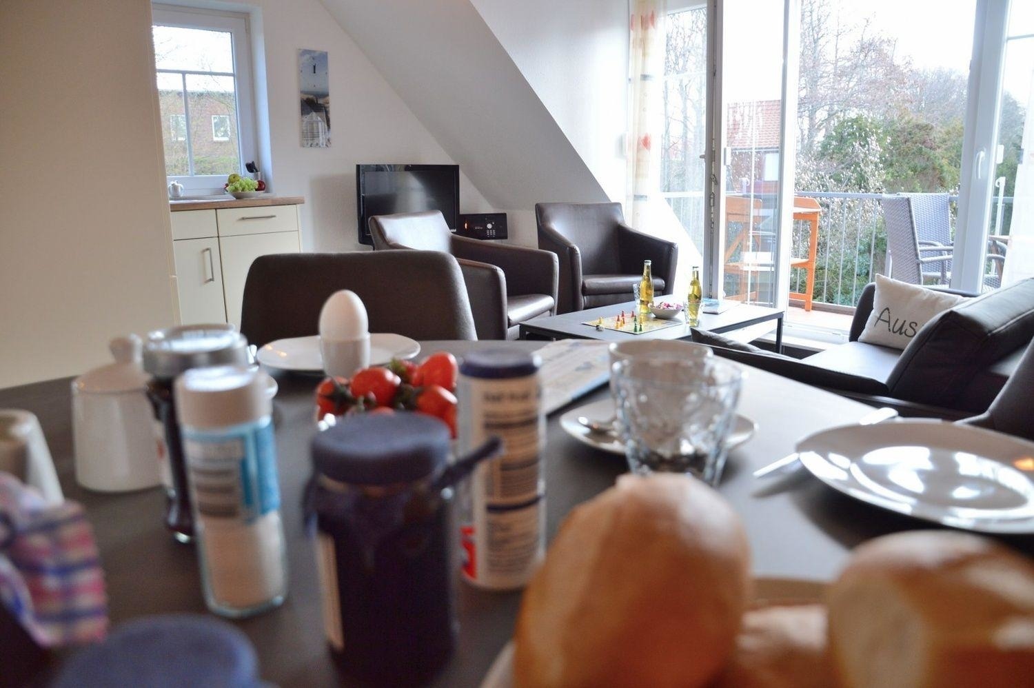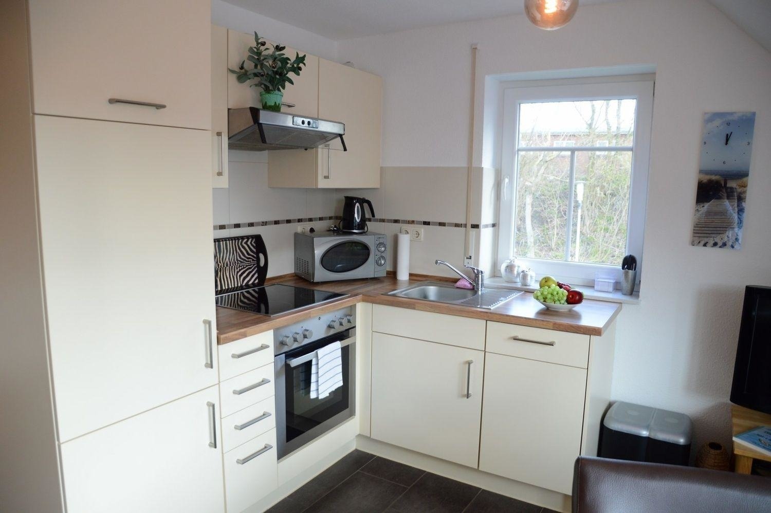 In dieser schicken OG-Wohnung werden Sie sich wohlfühlen. Der in warmen Naturtönen gehaltene Wohnbereich beherbergt neben gemütlichen Möbeln ein Flachbildschirm-TV, einen DVD Player und eine Stereoanlage. Die offene Küche mit Backofen, Mikrowelle und Ceranfeld schließt mit dem Essbereich ab.