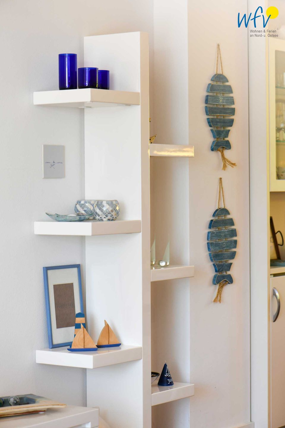 Im hellen Wohnraum (1.OG) empfängt Sie eine einladende Einrichtung in harmonischen Farben; maritime Accessoires sorgen für gemütliches Flair und das entsprechende Nordseegefühl. Von diesem Raum aus sehen Sie bereits sehr schön das Wattenmeer!