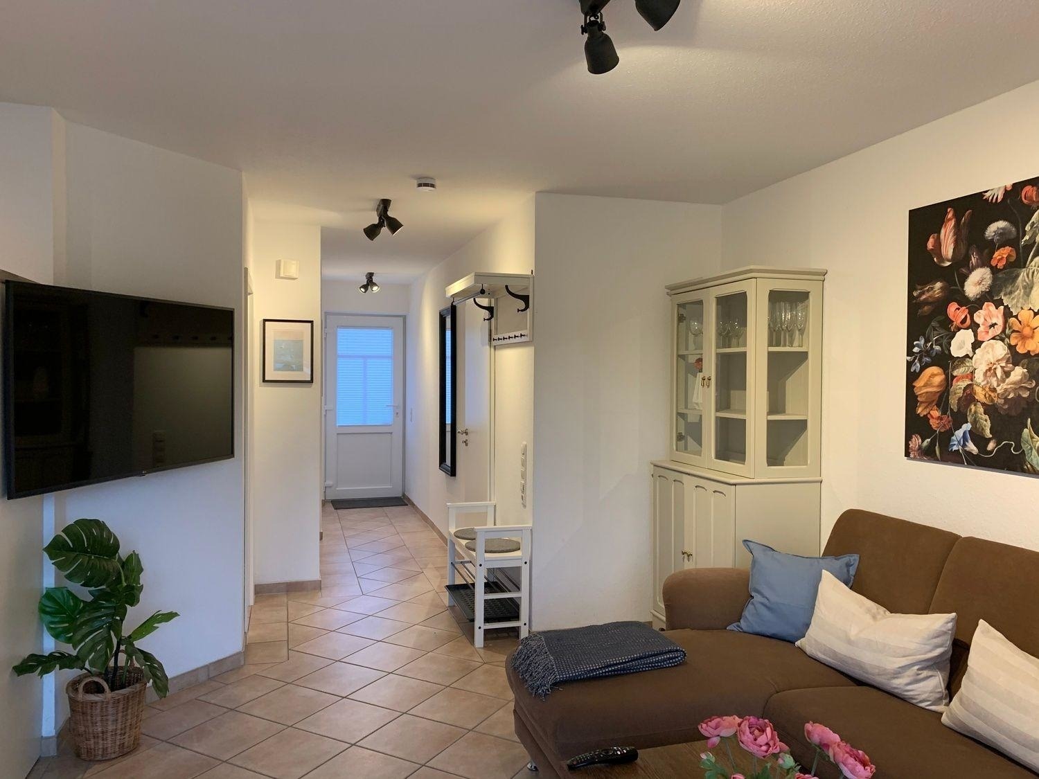 Im Wohnbereich kann man entspannt vom Esstisch wie auch von der Couch auf dem Flachbildschirm- TV abschalten.