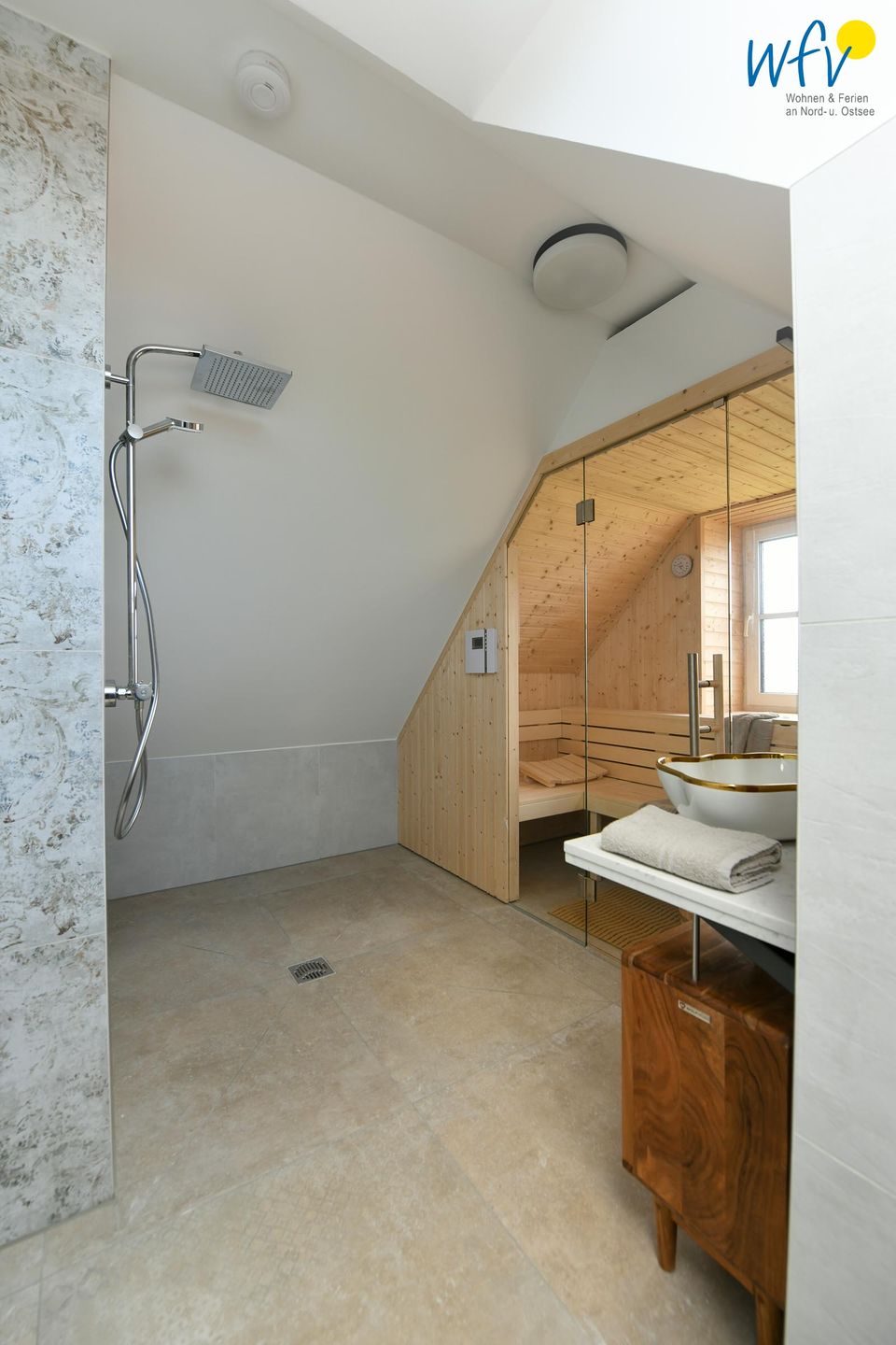 Zwei elegante Tageslichtbäder im Dachgeschoss und im Spitzboden sorgen für angenehme Ausweichmöglichkeiten. In dem oberen Bad mit Dusche und eigener Sauna genießen Sie wohltuende Entspannungszeit.