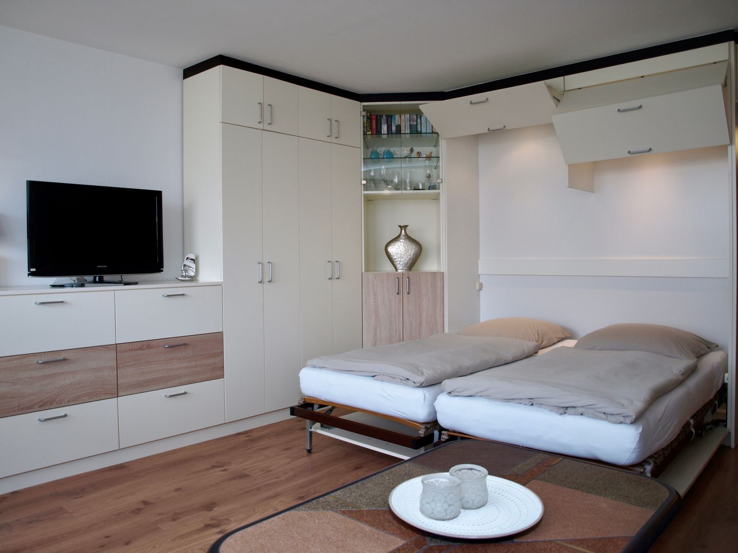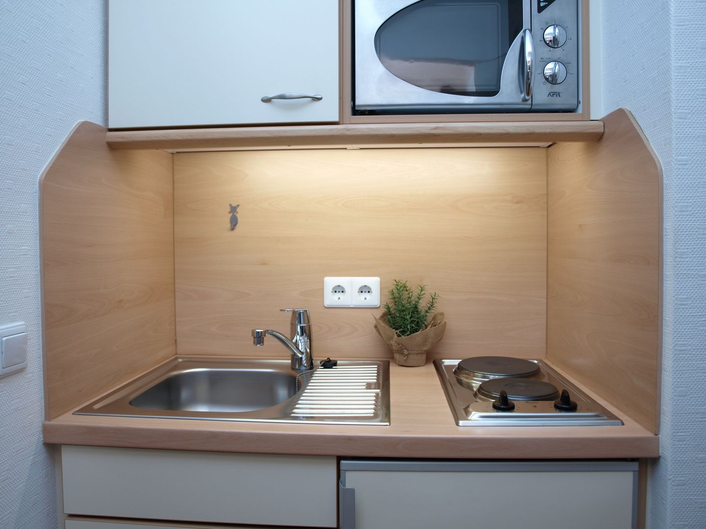 Die Wohnung selbst besticht durch ein modernes, helles Design. Die Küchenzeile ist mit einem Zweiplattenherd und einer Mikrowelle ausgestattet. Im Badezimmer befinden sich Dusche und WC. Besonders praktisch ist das Schrankbett, das sich tagsüber verstauen lässt und so für mehr Bewegungsfreiheit sorgt.